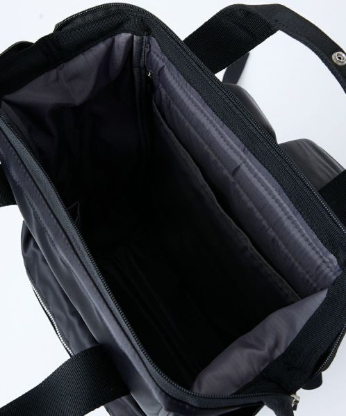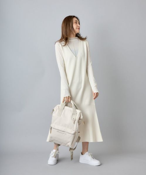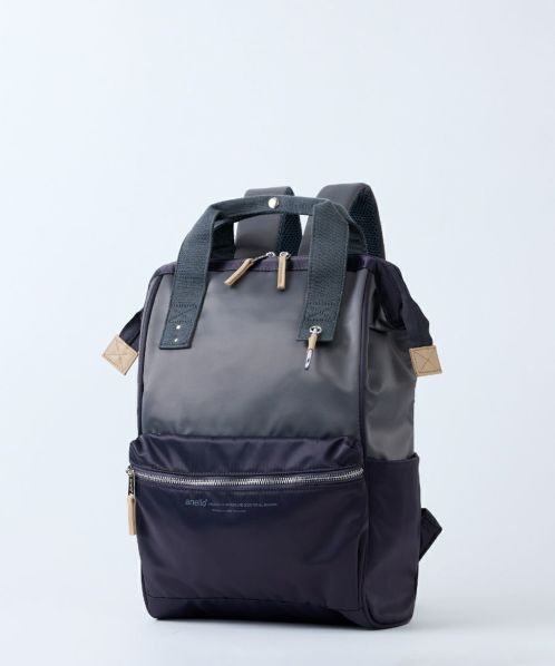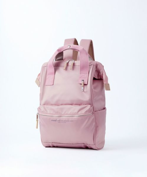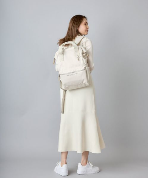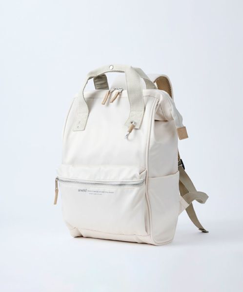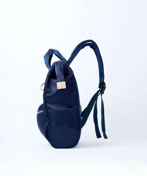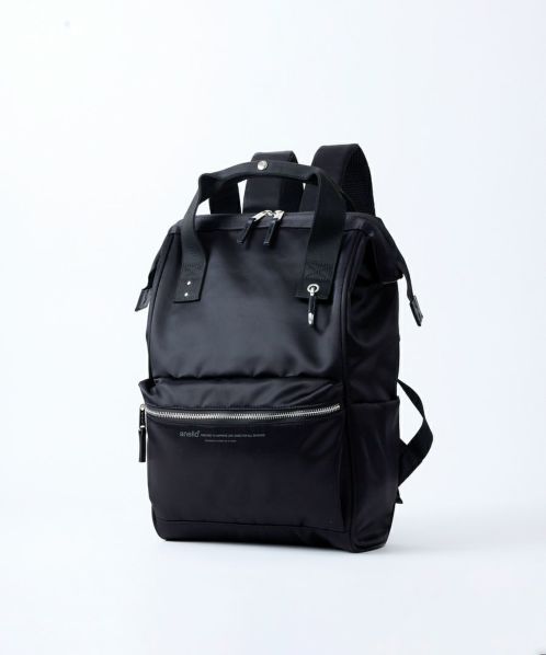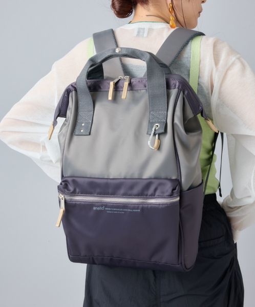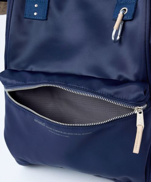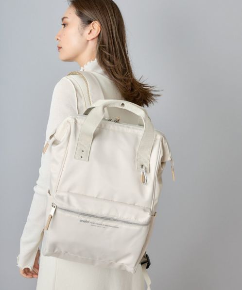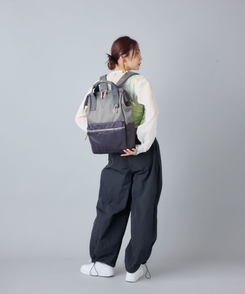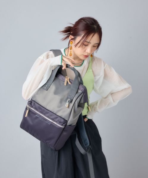 光沢感が美しいはっ水ナイロンの本体生地に同色コットン長テープを合わせ、高級感のあるシルバーファスナーをあしらった“ELEANOR”(エレノア)シリーズ。両面はっ水加工のため汚れが付きにくく、雨の日のお出掛けでも安心。フロントにあるカラビナにはリール付きパスケースやお気に入りのストラップを付けることができます◎aレギュラーサイズの口金リュックは13インチのPCが収納可能。背面にはキャリーオンテープが付いていて、旅行や出張の際に活躍します。スリムなシルエットですっきりとお持ちいただけます。