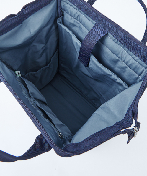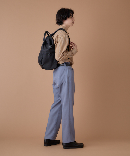 ファスナーや使い合わせの素材は本体カラーと同色に。金具カラーもシルバーにし、落ち着いた印象に仕上げました。また、今までになかったグレーベージュの色を新たに作成。開口部が口金仕様で、大きく開くので荷物の出し入れが楽々です。背面には貴重品を収納できるセキュリティーポケットと本体収納へ直結するファスナー付き。22L収納できる大きめ容量なので、幅広いシーンで活躍すること間違いなし。機能性と使いやすさの備わった、他にはない特別感の詰まったアイテムです!