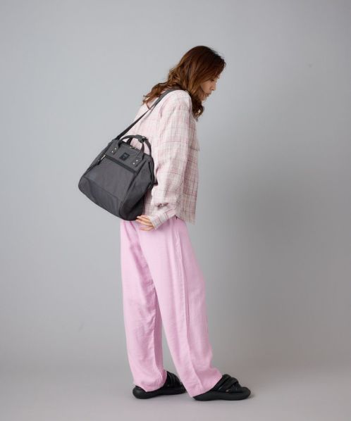 ペットボトルリサイクル生地のREPREVEに、風合い豊かな杢糸生地が登場!ファスナーや刺繍ネーム、引手パーツを本体と同色にし、艶をおさえたシルバー金具で全体のバランスをとりました。口金型のA4サイズが収納可能なショルダーバッグ。すっきりとした見た目でマチは14cmと意外としっかりと荷物が入るのがうれしいポイント。キャリーオンテープ付きなので旅行の手持ちバッグとしても便利。