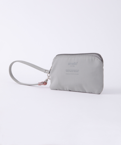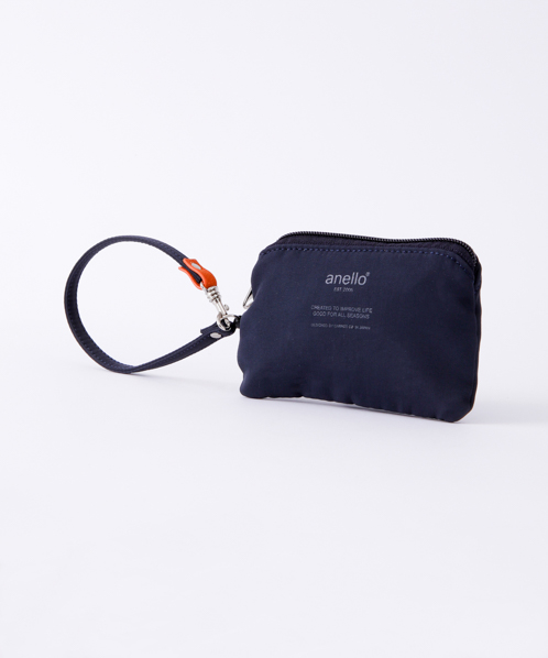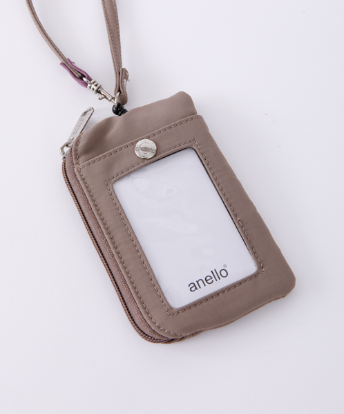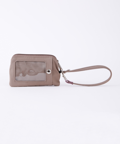 ハリのあるグログラン調ナイロンを使用したシンプルでベーシックなデザイン。スエードタッチ生地をカラーアクセントにしたカラビナパーツがポイント。コインケースとパスケースが合体し、便利なアイテム。リール付きでバッグに取り付けてもワンポイントになり、バッグにつけたままICカードなどのタッチができます。