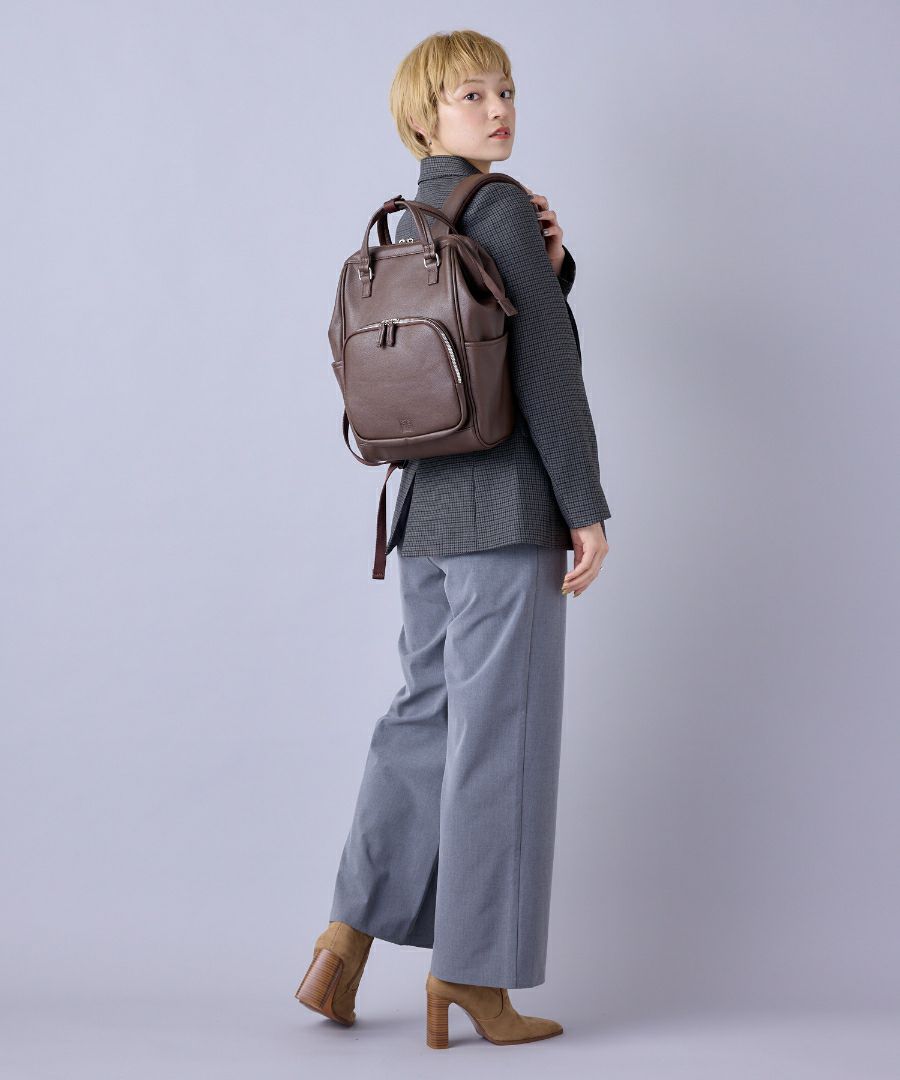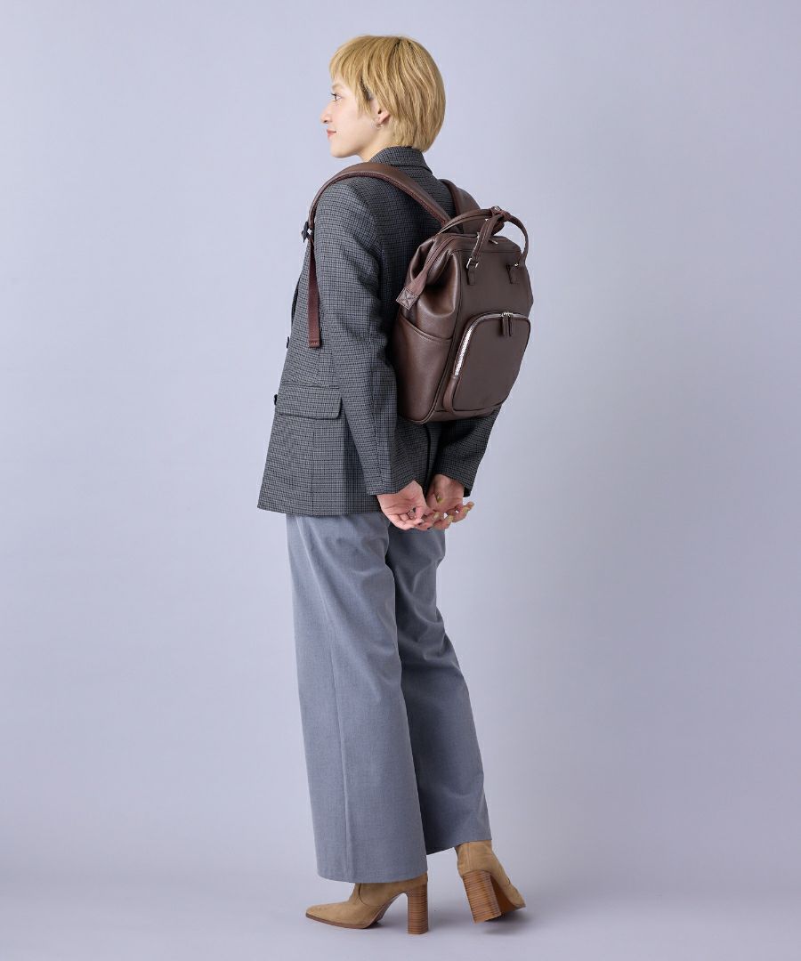 程よくトレンド感を組み込んだ風合いの良い合皮を使用したCHERISH(チェリッシュ)シリーズ。金属ビスロンファスナーの立体ポケットや引き手のデザインで上品な雰囲気に。キャリーオンテープ付きなので旅行にも最適です◎
