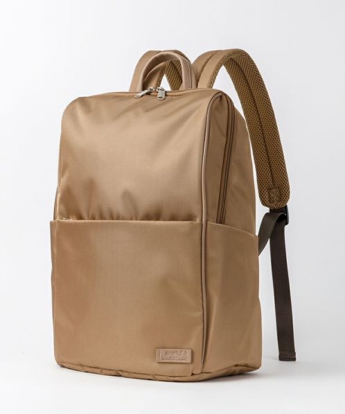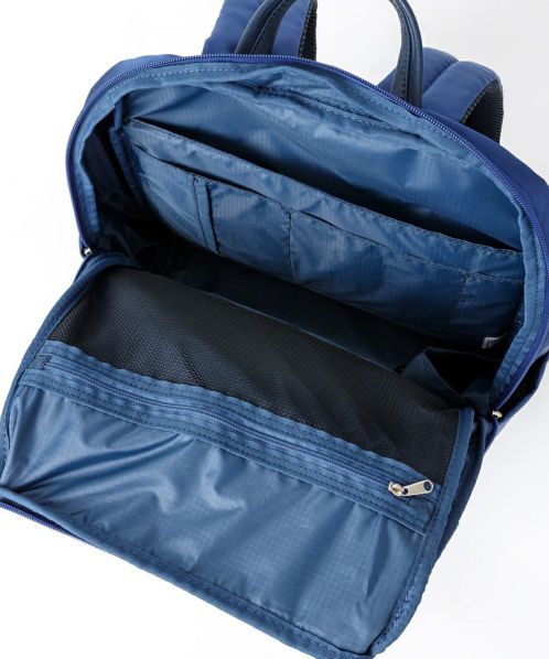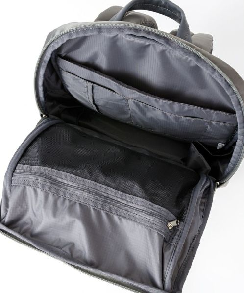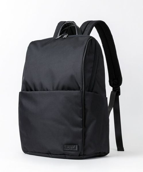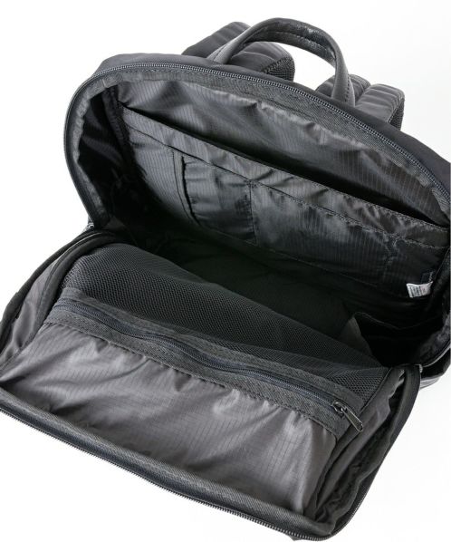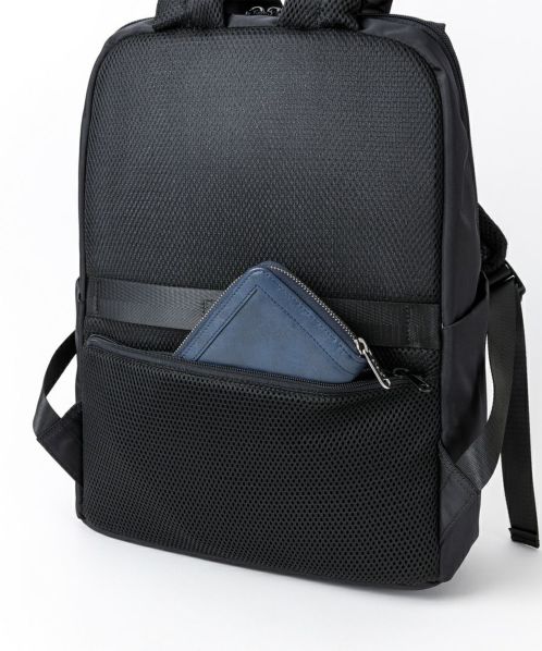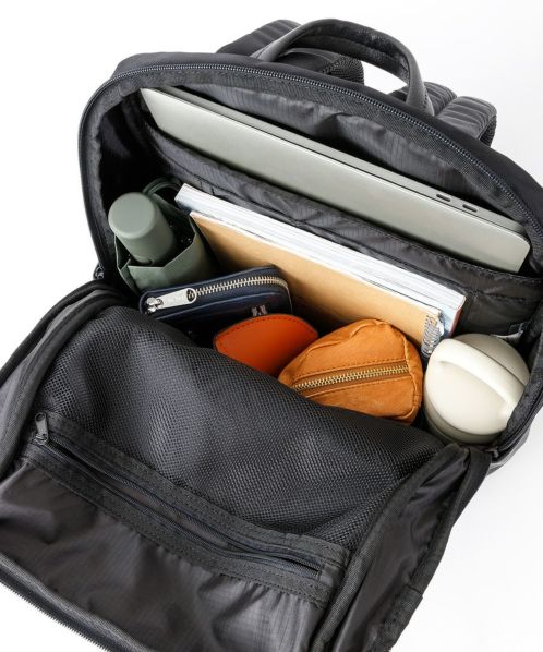 光沢感のあるポリエステルツイルにポイントで合皮を使用し、上質感のある印象に仕上げた多機能リュック。スリムな形状なので男女問わずすっきりとお持ちいただけます。両面はっ水・軽量仕様のため普段使い~通勤通学におすすめ。内側には新機能のティッシュポケットがあり、使用後は後ろのポケットへ。