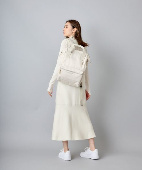 光沢感が美しいはっ水ナイロンの本体生地に同色コットン長テープを合わせ、高級感のあるシルバーファスナーをあしらった“ELEANOR”(エレノア)シリーズ。両面はっ水加工のため汚れが付きにくく、雨の日のお出掛けでも安心。フロントにあるカラビナにはリール付きパスケースやお気に入りのストラップを付けることができます◎aレギュラーサイズの口金リュックは13インチのPCが収納可能。背面にはキャリーオンテープが付いていて、旅行や出張の際に活躍します。スリムなシルエットですっきりとお持ちいただけます。