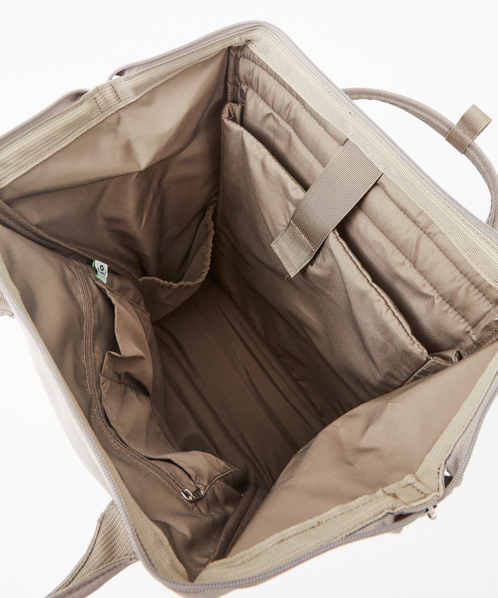 ファスナーや使い合わせの素材は本体カラーと同色に。金具カラーもシルバーにし、落ち着いた印象に仕上げました。また、今までになかったグレーベージュの色を新たに作成。開口部が口金仕様で、大きく開くので荷物の出し入れが楽々です。背面には貴重品を収納できるセキュリティーポケットと本体収納へ直結するファスナー付き。22L収納できる大きめ容量なので、幅広いシーンで活躍すること間違いなし。機能性と使いやすさの備わった、他にはない特別感の詰まったアイテムです!