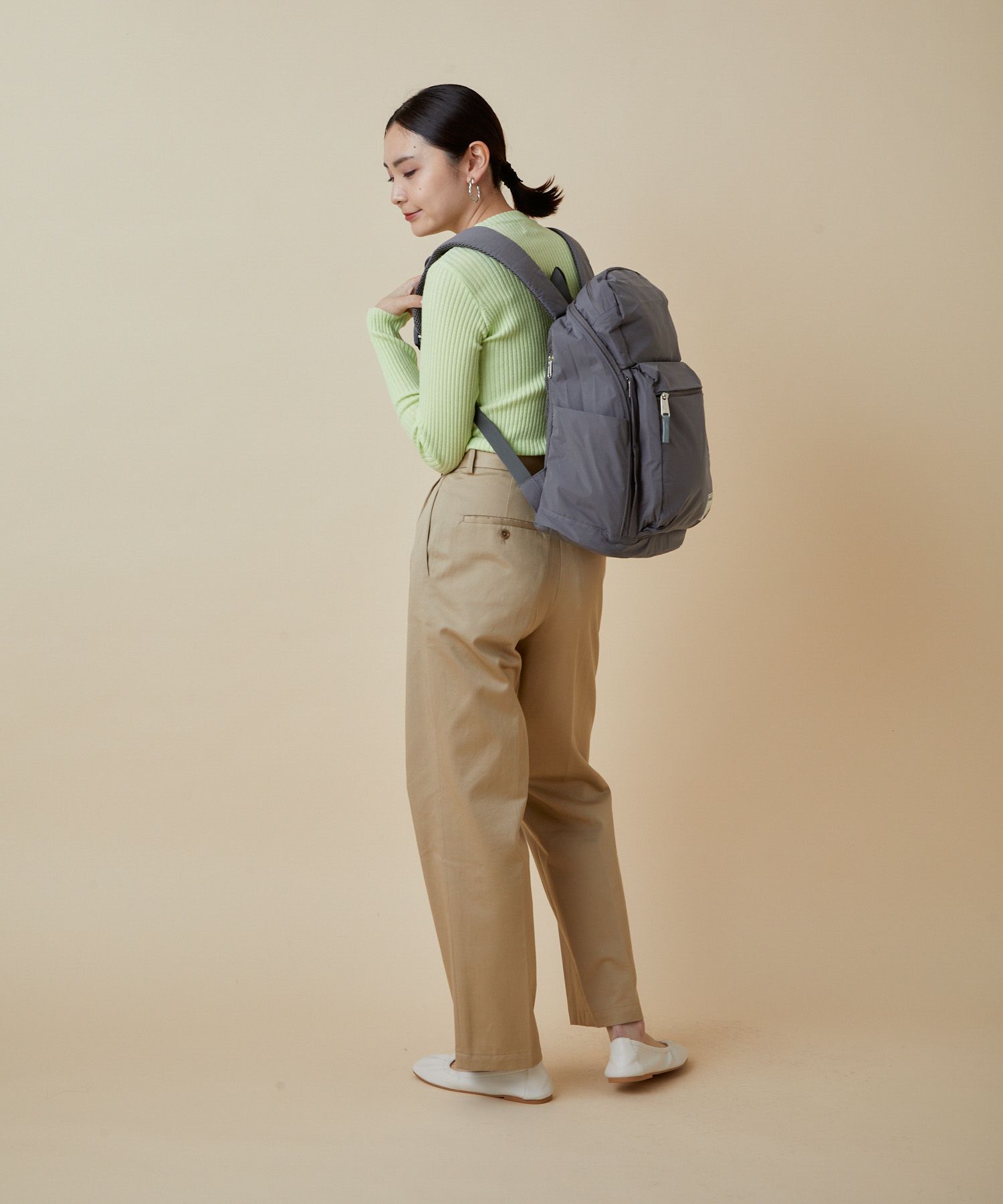 柔らかな肌触りのコットン調撥水生地を使用することで、あたたかみのある優しい印象に。合皮の引手がアクセントになり、上品な仕上がりです。メイン開口部が大きく開くので荷物の出し入れも楽々。大きすぎず小さすぎない程よいサイズ感です。背面にはセキュリティーポケットと本体収納へ直結するファスナー付きなので、収納も便利です。 シリーズ一覧