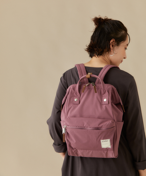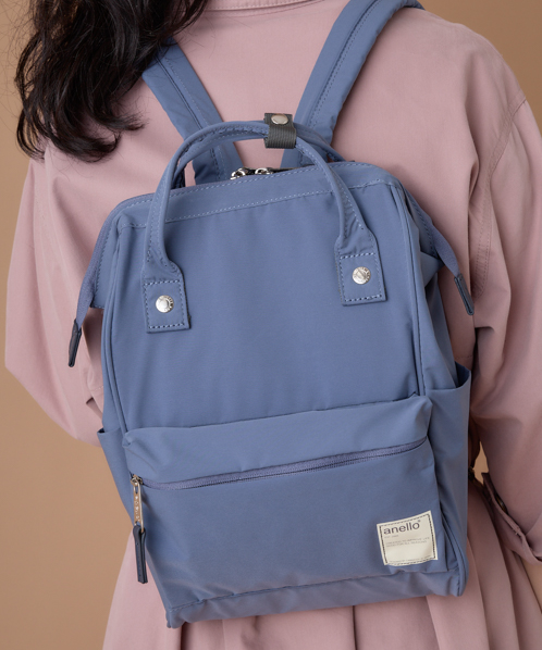 柔らかな肌触りのコットン調撥水生地を使用することで、あたたかみのある優しい印象に。合皮の引手がアクセントになり、上品な仕上がりです。定番の口金リュック、スモールサイズの薄マチタイプは、体にフィットしやすく持ちやすい小ぶりなサイズ感が人気のポイント。背面には貴重品を収納できるセキュリティーポケットと本体収納へ直結するファスナー付きで安心感と便利さも兼ね備えたリュックです。