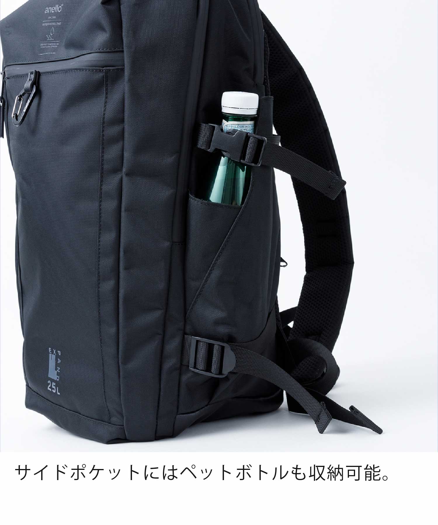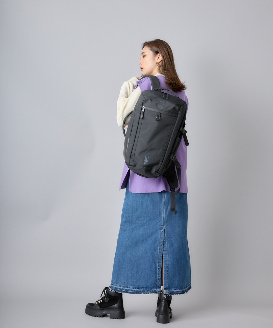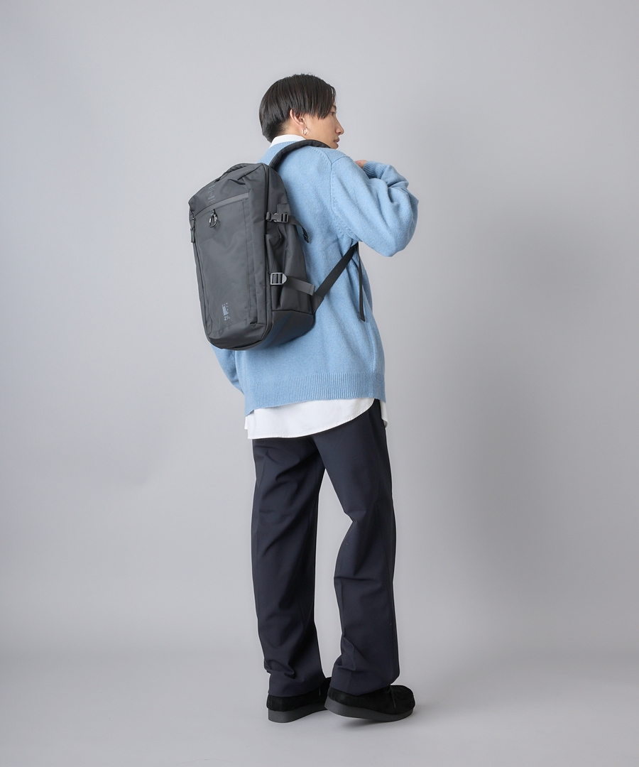 オフィシャルストア限定の特別なデザインです。クリアのブランドネームとシリーズ名“EXPAND”のロゴで凝った印象に。ワンランク上の特別なアイテムに仕上げました。撥水加工なので雨の日も安心しておでかけできるのが嬉しいポイント◎25L容量なので旅行にも最適です。