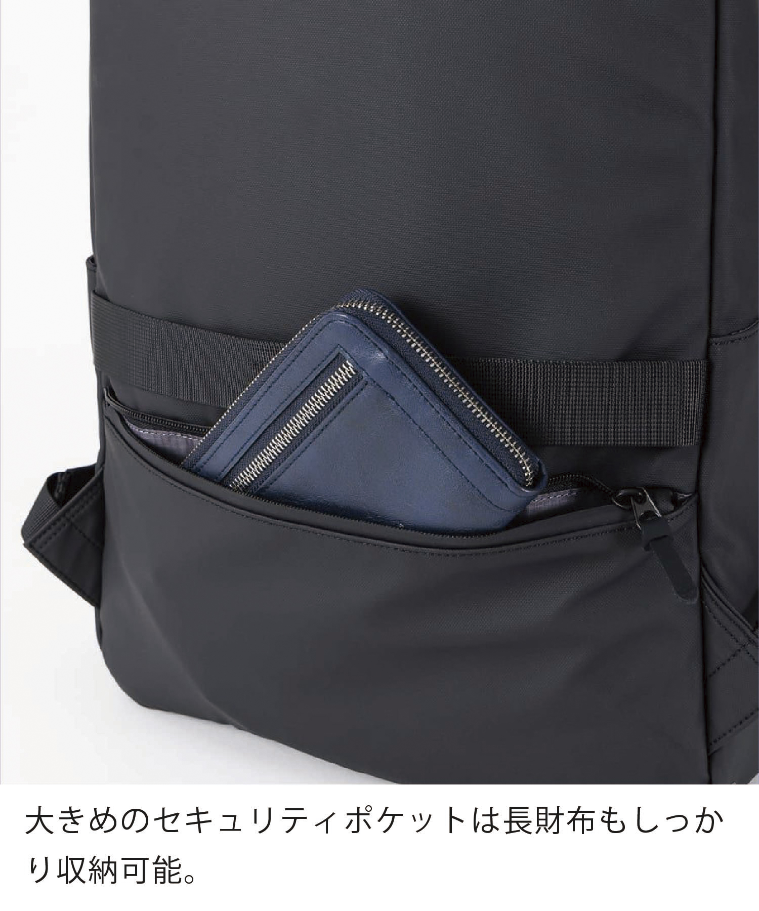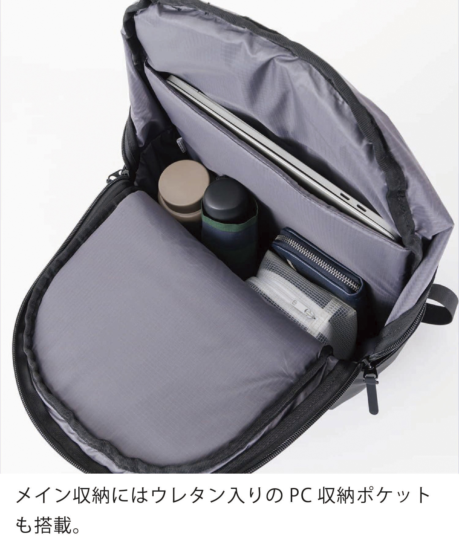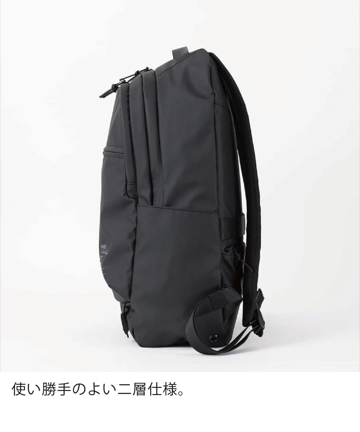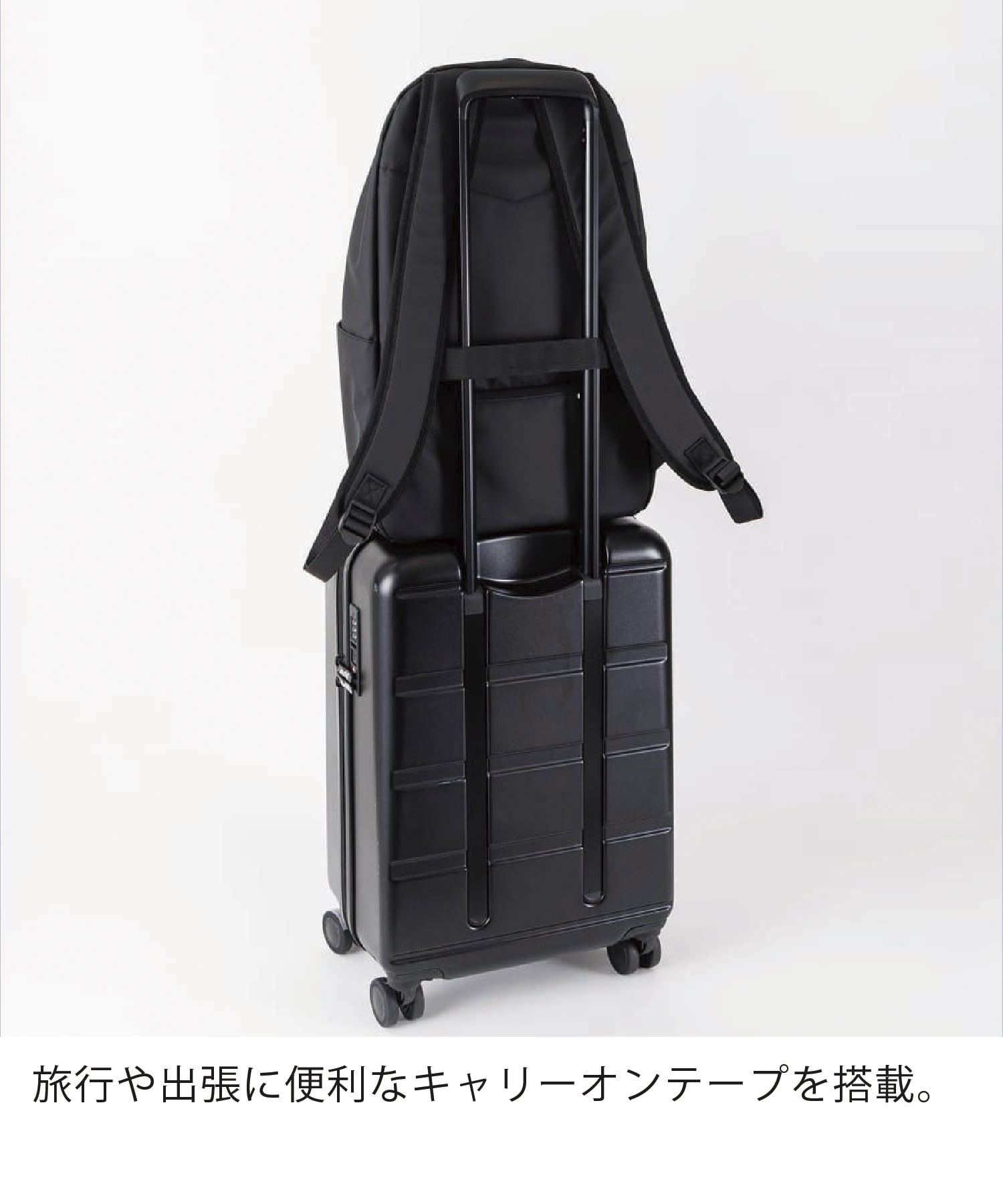急な雨にも対応!耐水生地を使用した、シンプルで使いやすい”NIMBUS”シリーズ。出張や旅行にもちょうど良いサイズ感。PC収納、11ポケット、キャリーオンテープも搭載しており機能面に優れたデイパック。