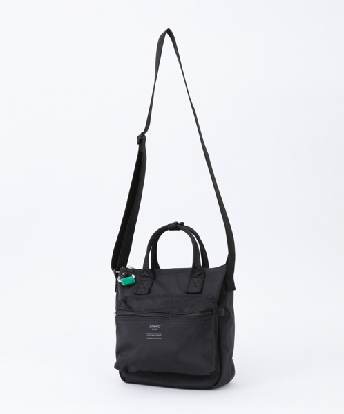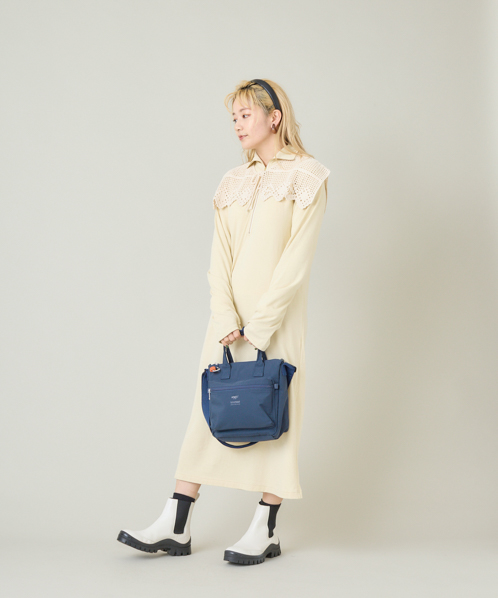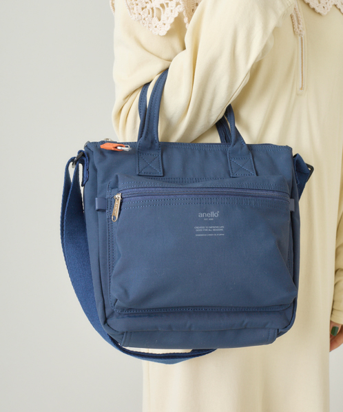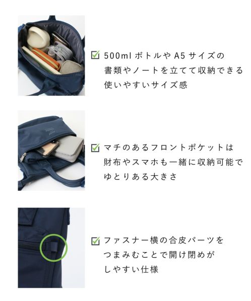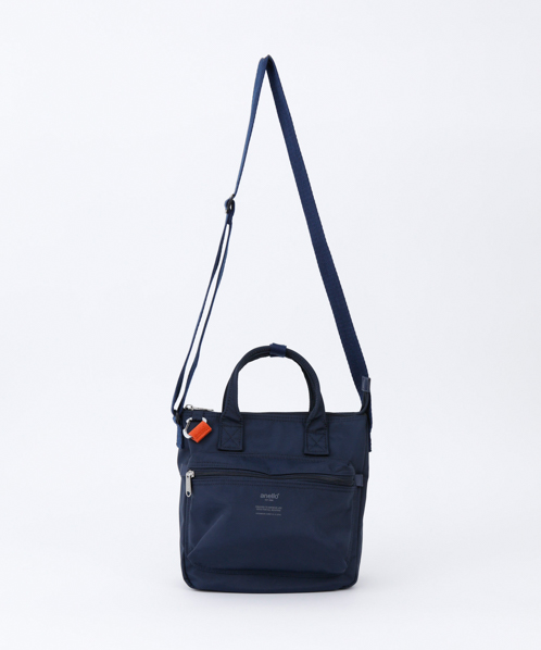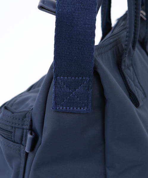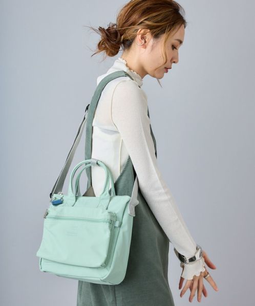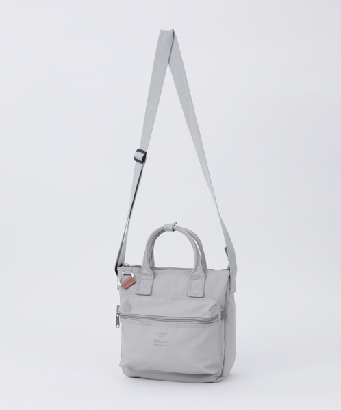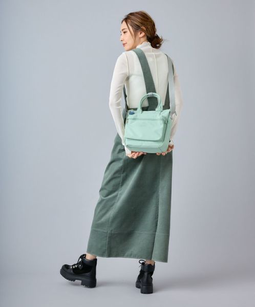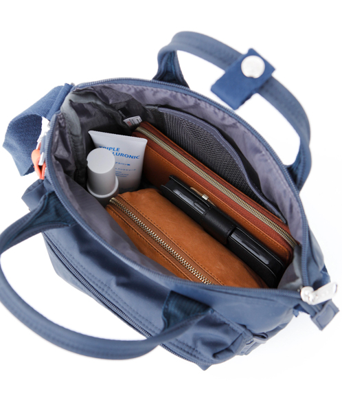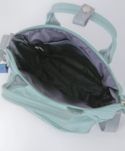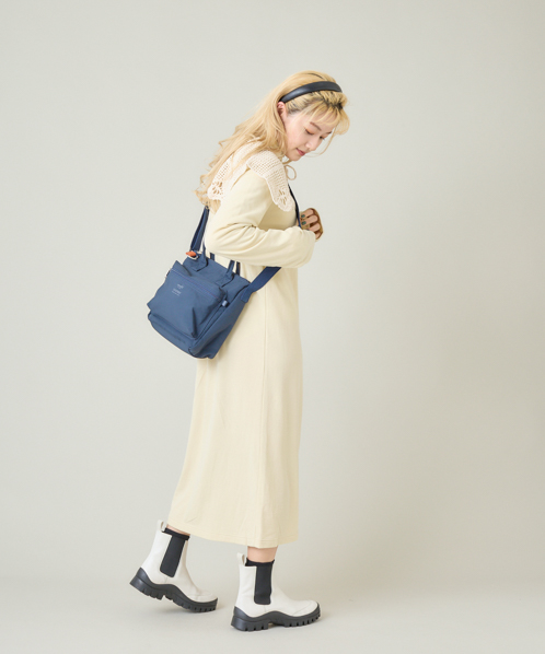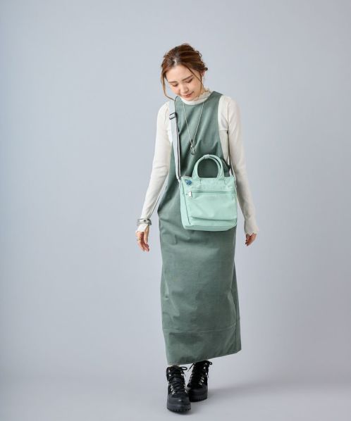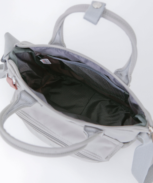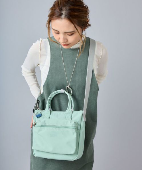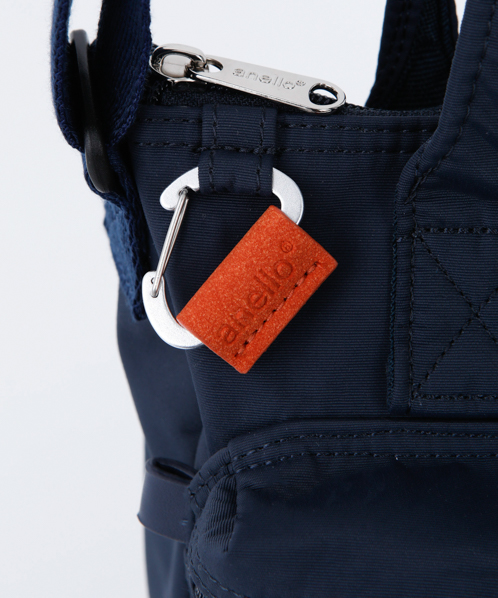 ハリのあるグログラン調ナイロンを使用したシンプルでベーシックなデザインシリーズ。500mlペットボトルが縦に収納ができるちょうどいいサイズ感。内側には見えやすいメッシュポケットがあるので鍵や小物が探しやすく便利◎両面撥水加工なので雨の日も安心です。スエードタッチ生地をカラーアクセントにしたカラビナパーツがポイント。