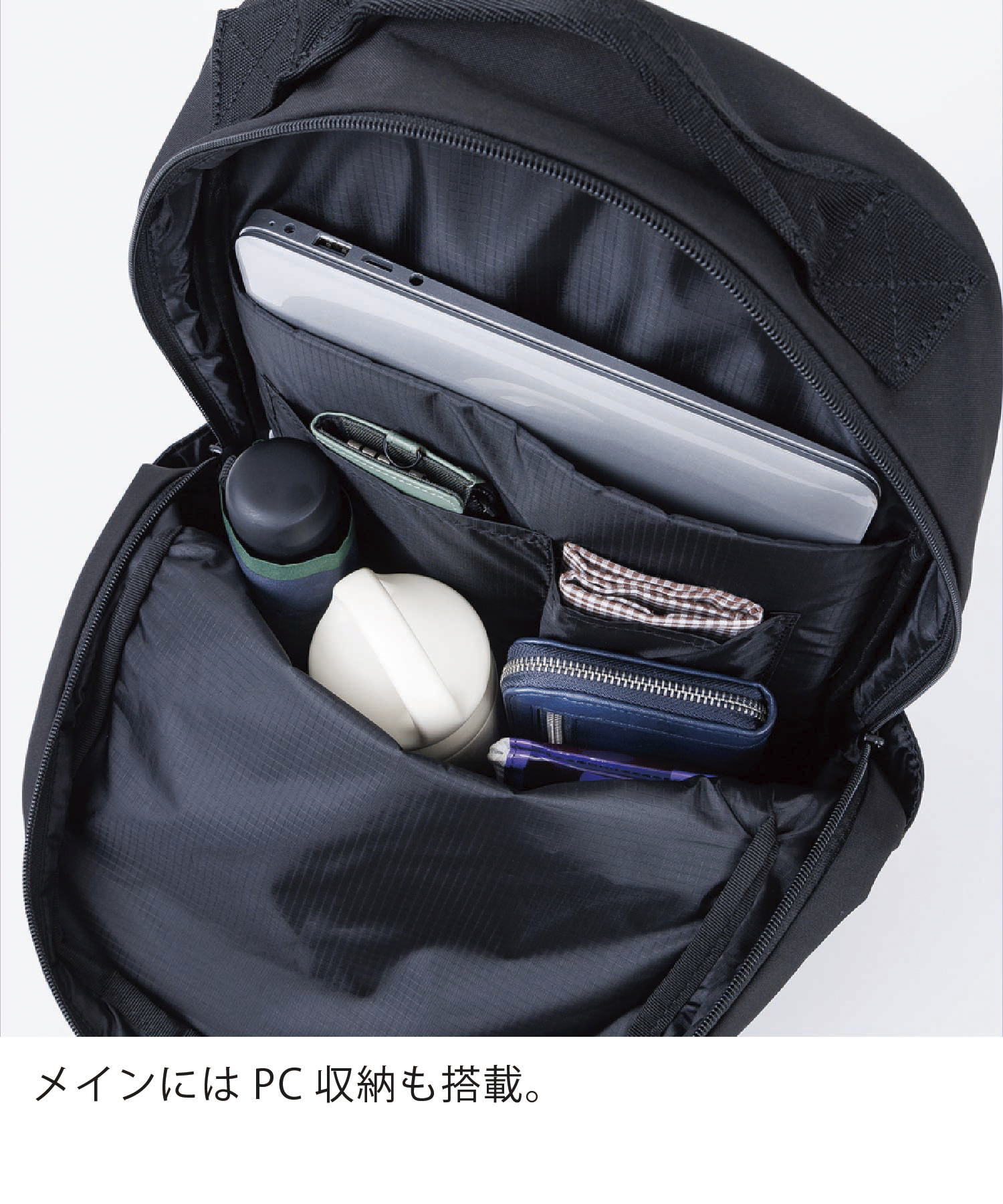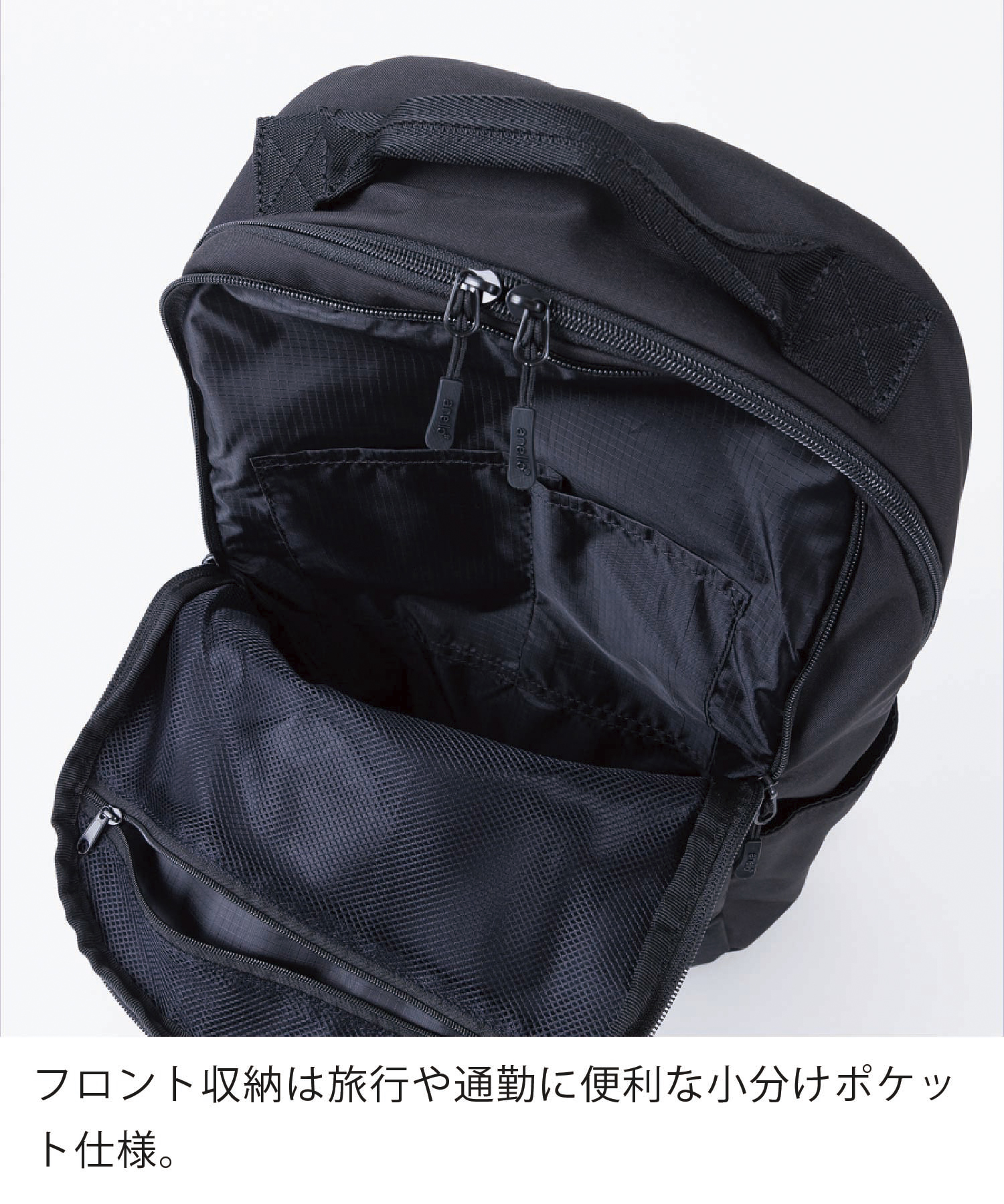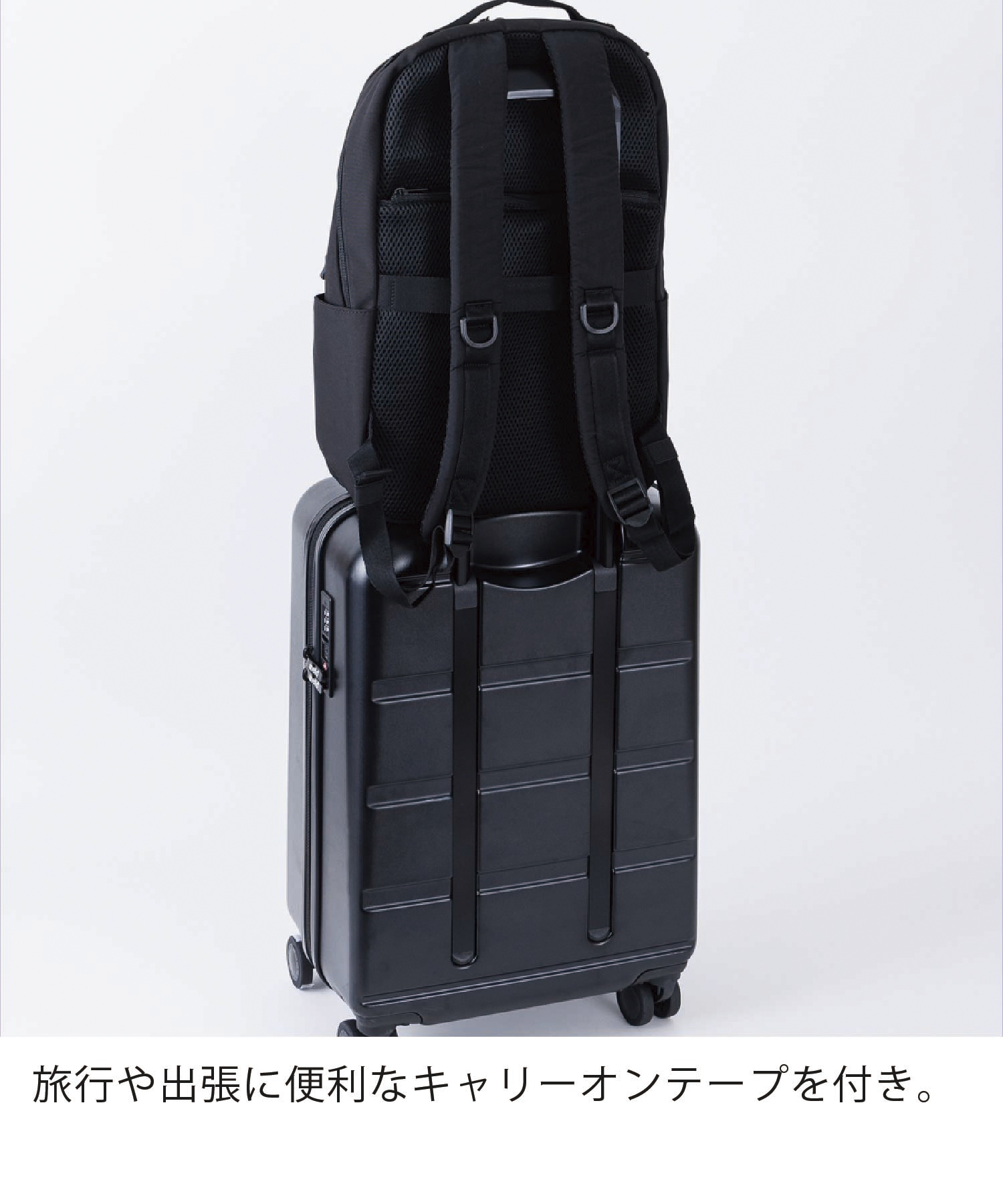 旅行やレジャーに最適なGUIDEシリーズ。ドライタッチな軽量素材を使用し、急な雨や汚れにも強い両面撥水仕様。正面のA4サイズのファスナーポケット内にドキュメント、細かい荷物を仕分けるファスナー、オープンポケット付き。15インチPC収納、キャリーオン、さっと持てるハンドル付きなのでビジネスシーンにも最適です。