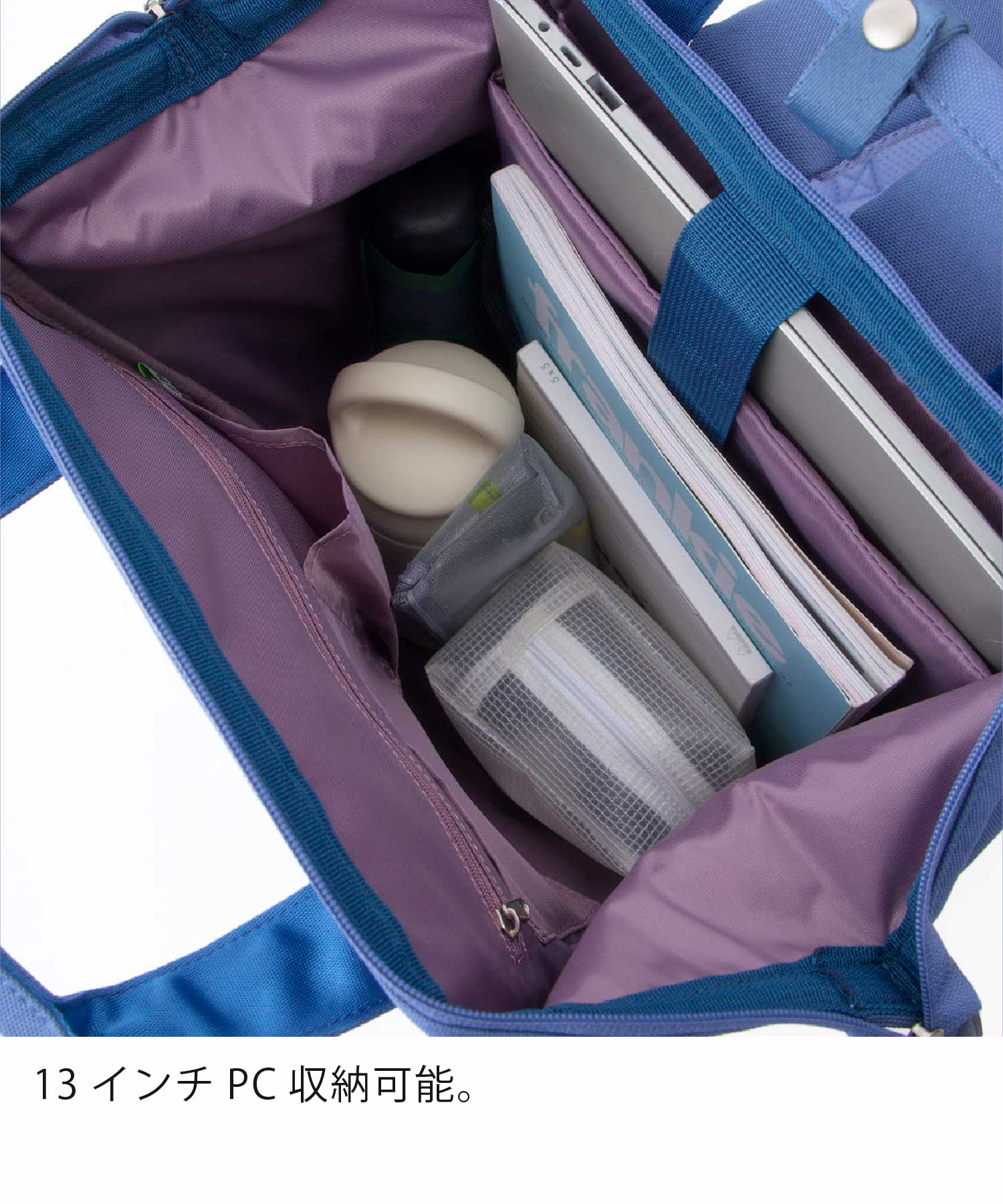 13インチのPCが収納可能で、容量は18Lなので、お弁当箱やポーチ、折りたたみ傘、羽織ものなど