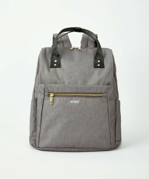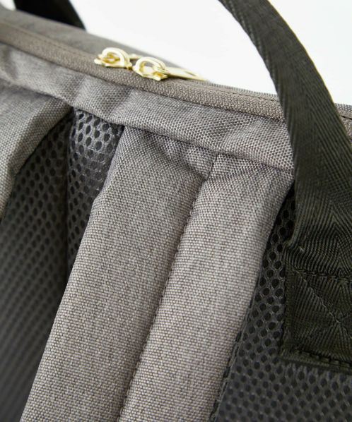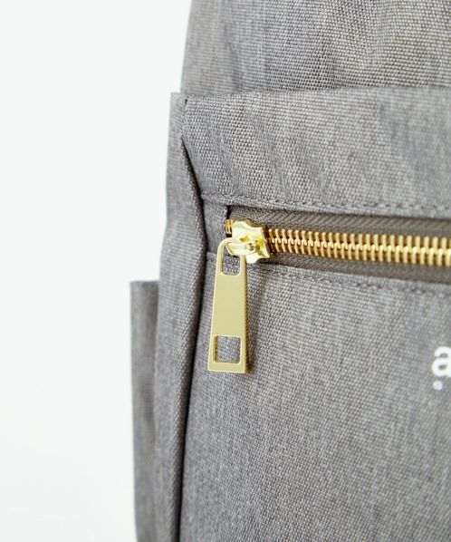 杢調ポリエステル生地にゴールド金具を使用し、カジュアル過ぎないデザインに仕上げました。内生地にも撥水加工を施しているので、内側も汚れにくい嬉しい仕様。開口部が大きく開くので、荷物の出し入れがとっても楽々です。10ポケットで小物収納もバッチリ。マザーズバッグとしてのお使いも◎