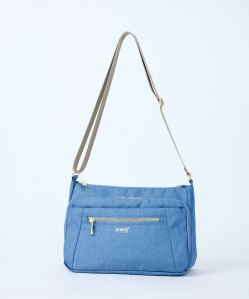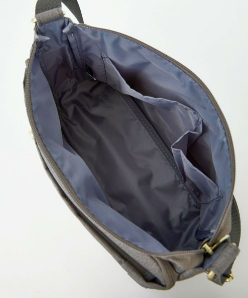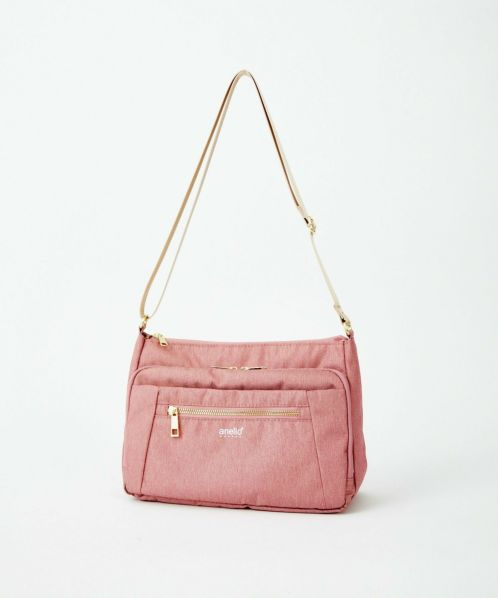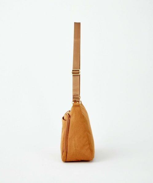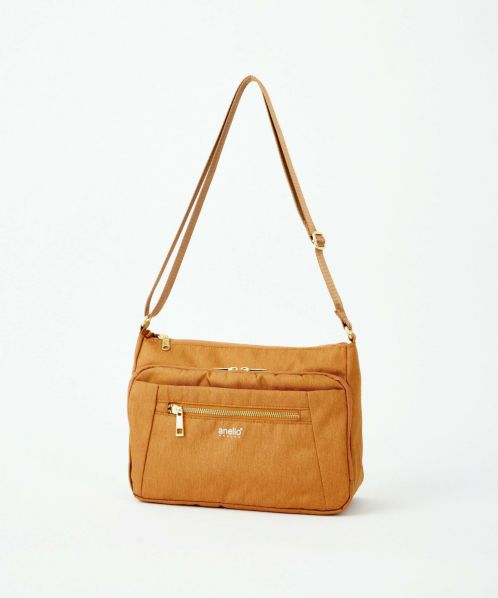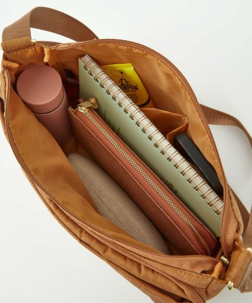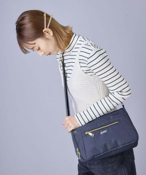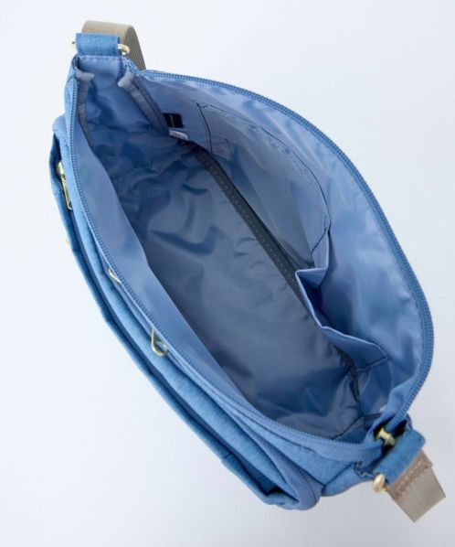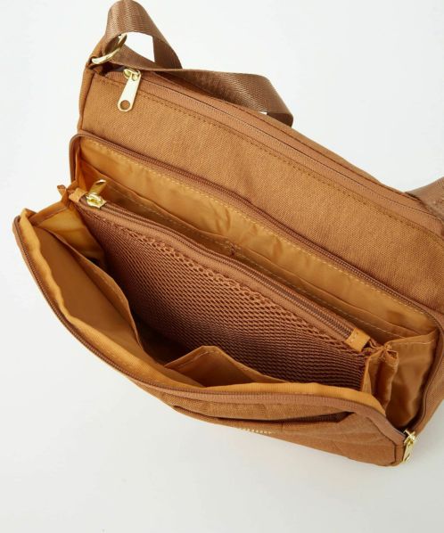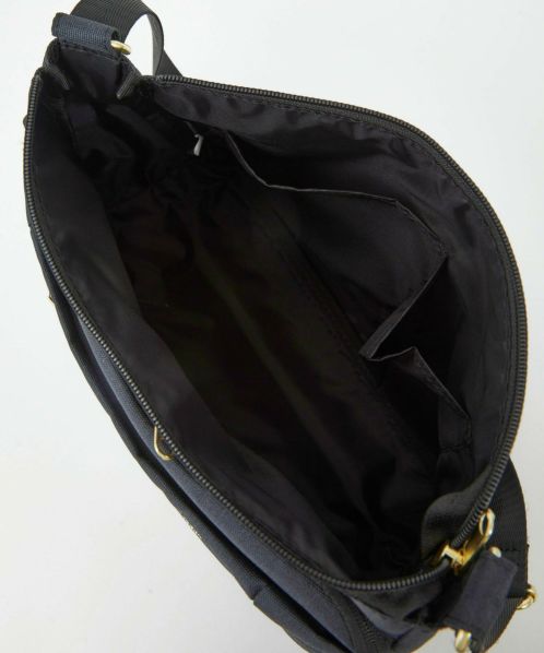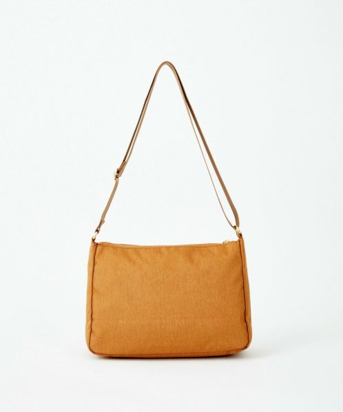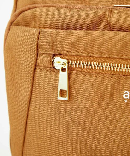 杢調ポリエステル生地にゴールド金具を使用し、カジュアル過ぎないデザインに仕上げました。内生地にも撥水加工を施しているので、内側も汚れにくい嬉しい仕様。小ぶりなサイズながら10ポケットで収納力抜群です。長財布や500mlのペットボトルなども入るサイズ感で、お買い物やお出かけにもお使いいただけます。