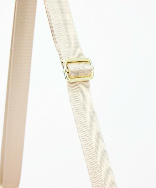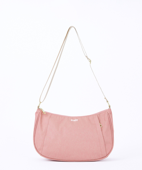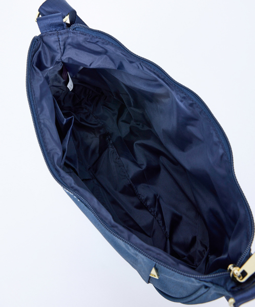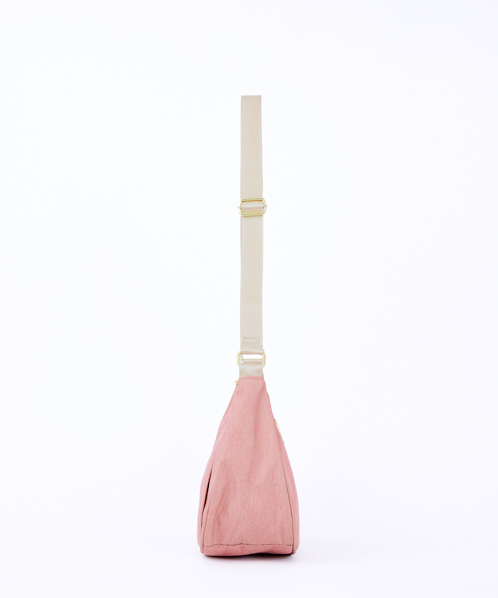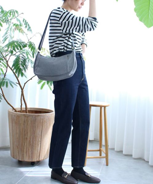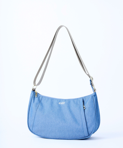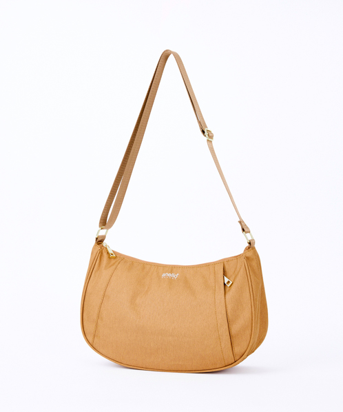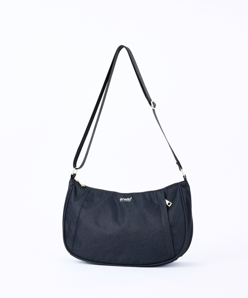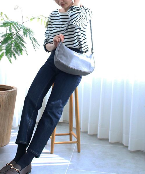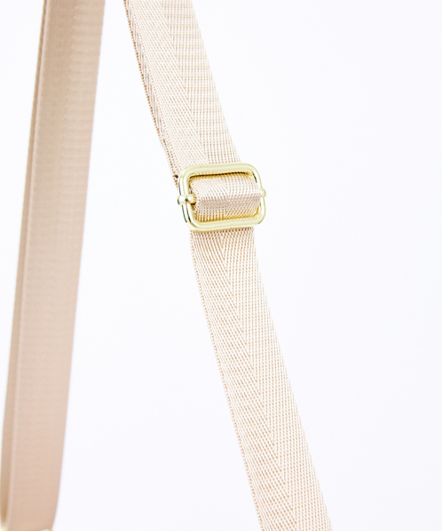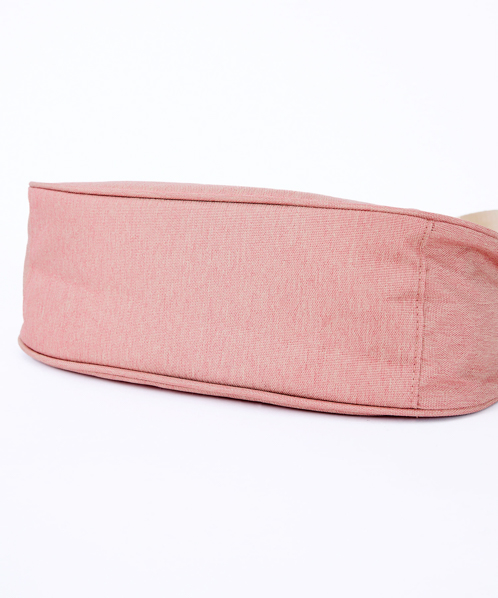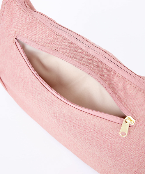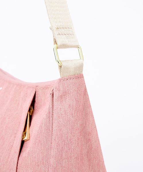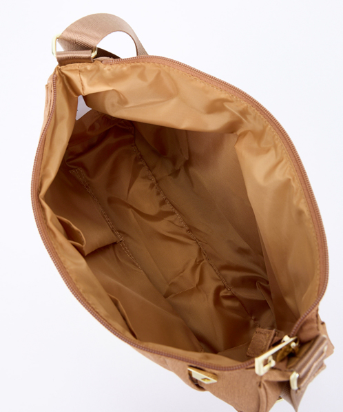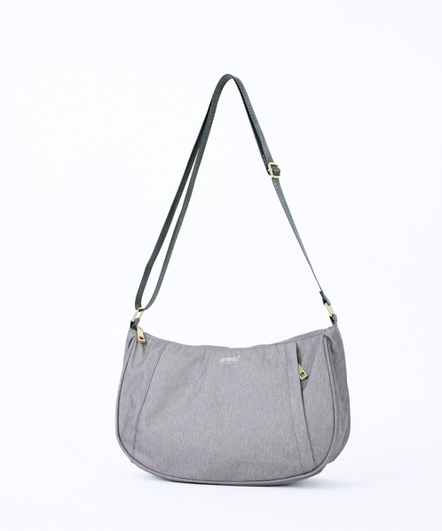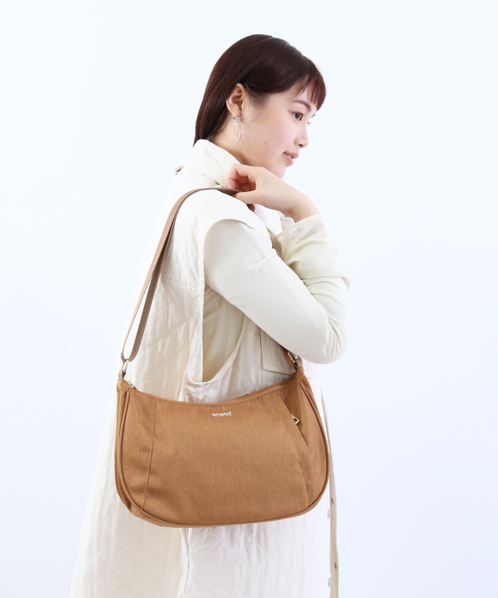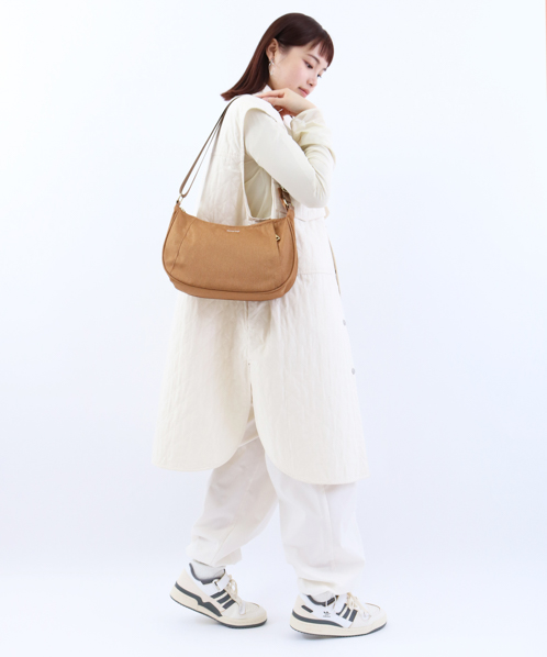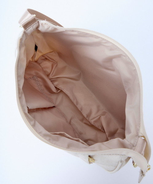 杢調ポリエステル生地にゴールド金具を使用し、カジュアル過ぎないデザインに仕上げました。内生地にも撥水加工を施しているので、内側も汚れにくい嬉しい仕様。A5サイズ収納可能でちょっとしたお出かけや買い物に最適です。