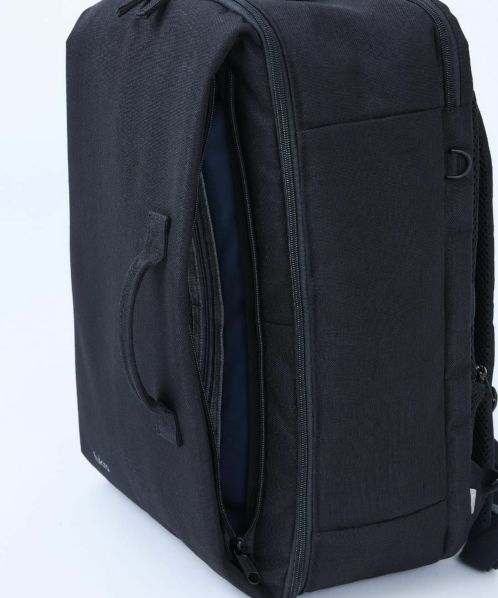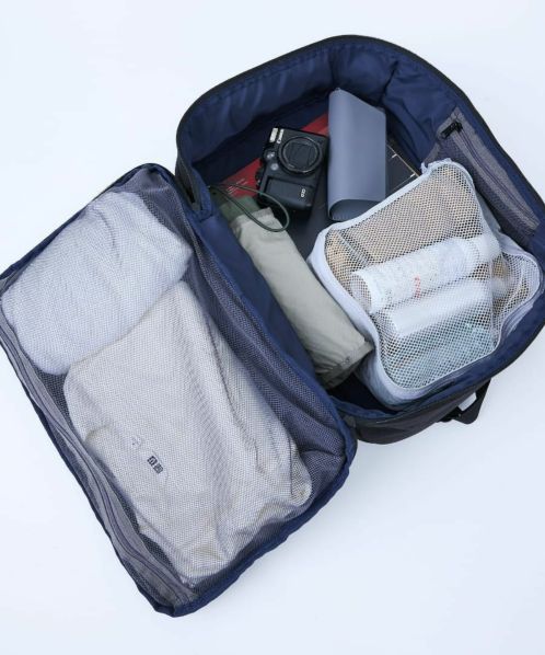 1泊2日の荷物をリュック一つでスマートに。ブランドのアイコニックとなる横開き仕様のリュック。大きなメッシュポケットは、荷物を可視化。立ったままでも荷物を取り出しやすいよう、ファスナーの始まり位置にもこだわっている。荷物が少なくても型崩れせず、自立する設計はどんな時もスタイリッシュ。