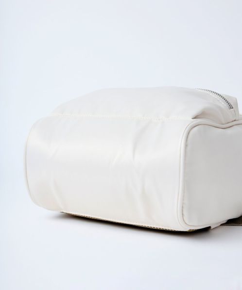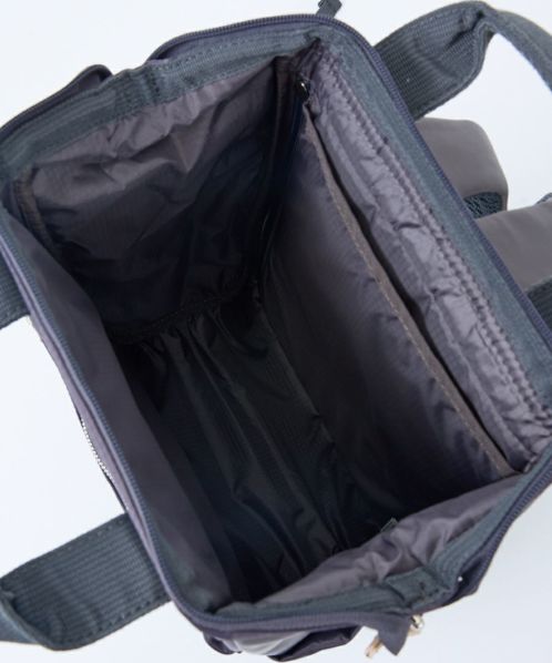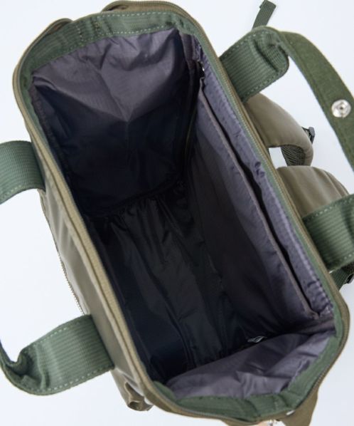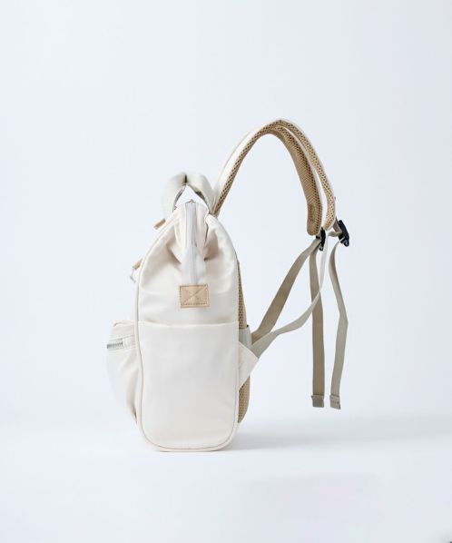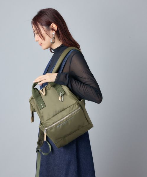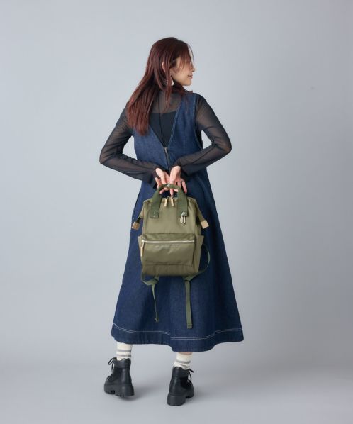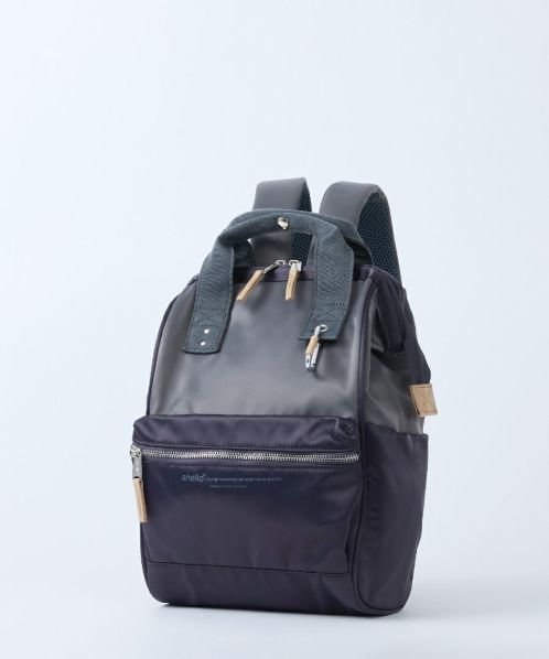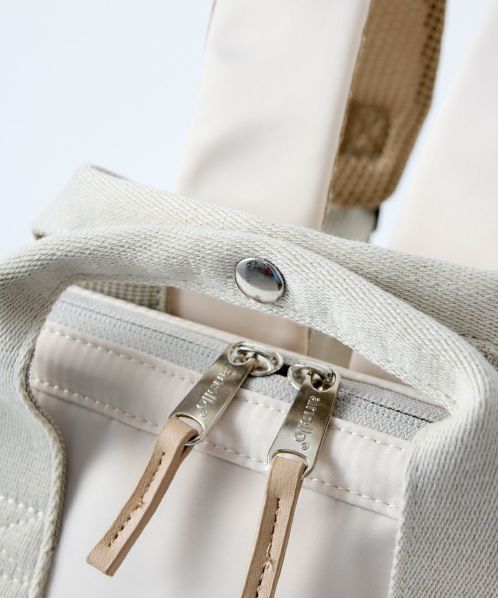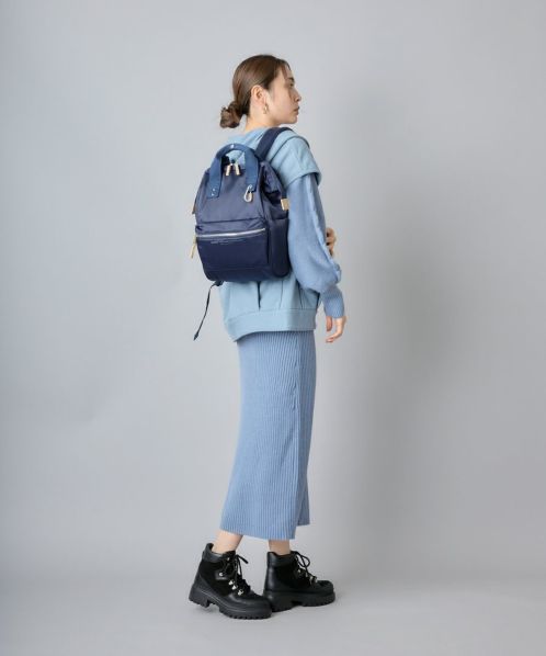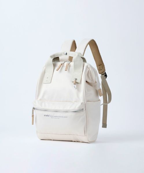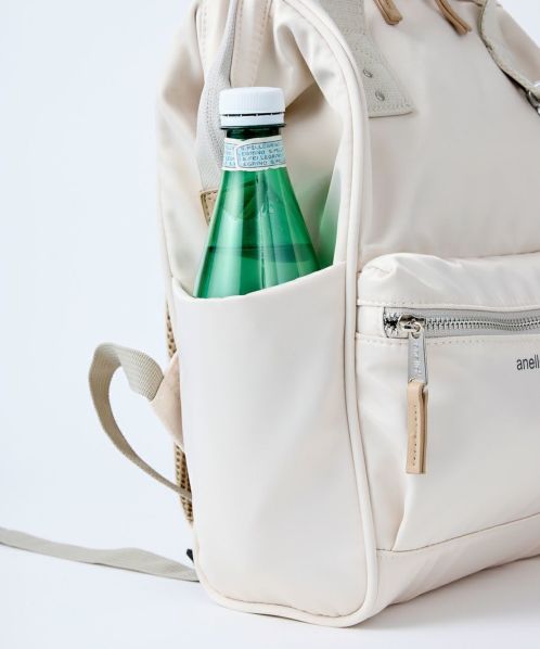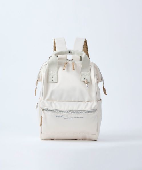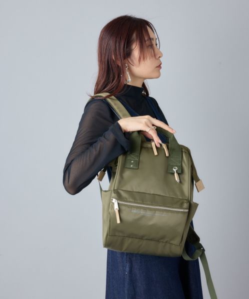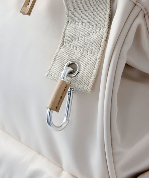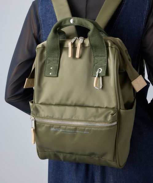 光沢感が美しいはっ水ナイロンの本体生地に同色コットン長テープを合わせ、高級感のあるシルバーファスナーをあしらった“ELEANOR”(エレノア)シリーズ。両面はっ水加工のため汚れが付きにくく、雨の日のお出掛けでも安心。フロントにあるカラビナにはリール付きパスケースやお気に入りのストラップを付けることができます◎スモールサイズの口金リュックはA4サイズが収納可能。背面にはキャリーオンテープが付いていて、旅行や出張の際に活躍します。スリムなシルエットですっきりとお持ちいただけます。