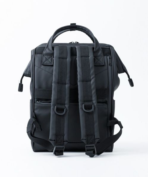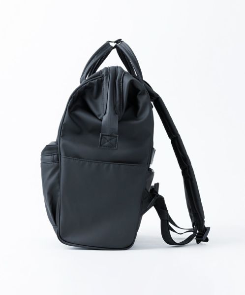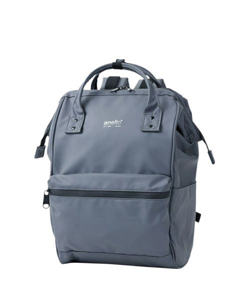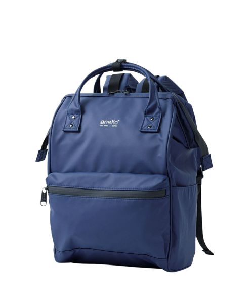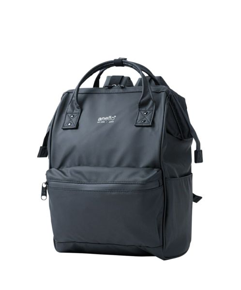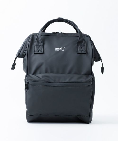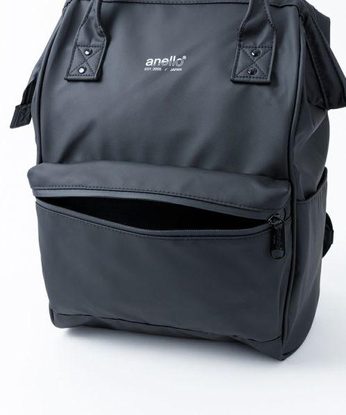 水を通しにくい生地を使用した耐水シリーズ。カラーリングとシンプルなデザインで、シーンや好みに合わせてお使いいただけます。anelloのアイコンバッグである口金を使用したレギュラーサイズのリュック。13インチのPCが収納可能で、セキュリティーポケットやキャリーオンテープなど充実した機能を搭載。普段使いだけでなく出張などのビジネスシーンにも◎