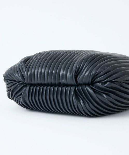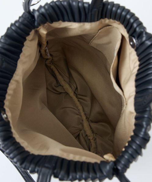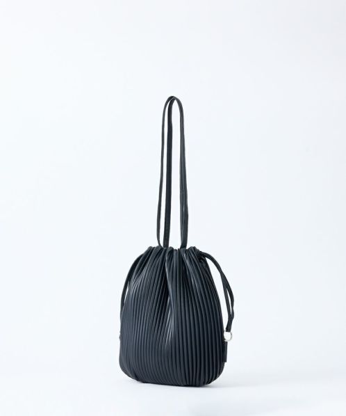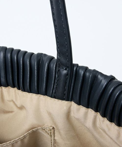 細かなプリーツと立体的な丸みのあるシルエットが魅力のアイテム。軽くて柔らかい、なめらかなフェイクレザーがポイント。キレイめ・カジュアル・フェミニンなど、どんなファッションにも馴染むデザインです。A5ノートがすっぽり入るトートバッグ。ペットボトルが縦型に入るサイズ感です。ハンドルは長めに設定されていて、肩にかけたまま荷物を取り出しやすいデザイン。内側にポケットがついているので、細かな荷物も収納しやすい仕様になっています。
