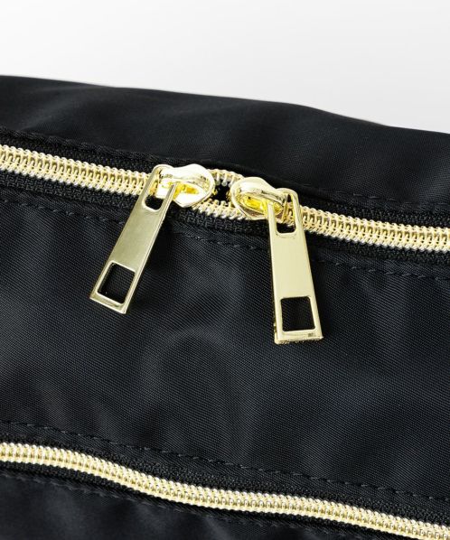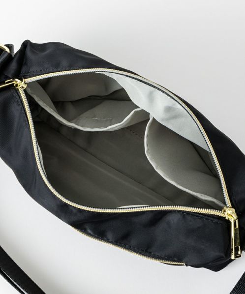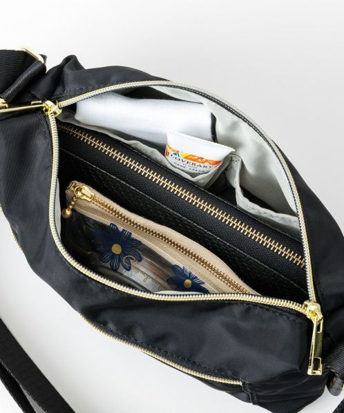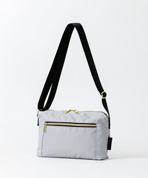 軽やかに持てる撥水ポリエステル生地のベーシックなバッグ。ハリのある生地とゴールドの金具が高見えする上品なシリーズ。撥水機能つきで雨の日やお子様と水場で遊ぶ際なども安心。内生地は明るめの配色なので、バッグの中の荷物が見やすいのが特徴です。500mlペットボトルと長財布が同時収納可能なミニショルダーバッグ。ショルダーは幅広めに設定しており肩に優しい仕様。外側のポケットはスマホが入るサイズ感で、ちょっとした外出に便利なアイテムです。