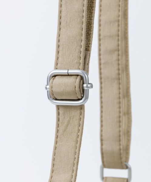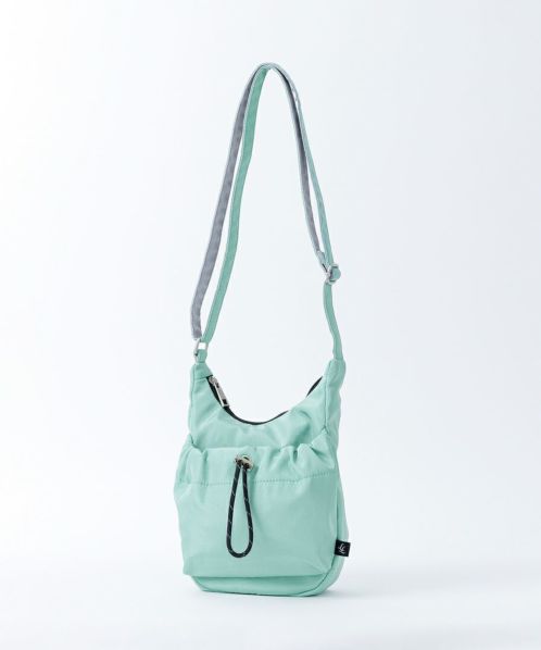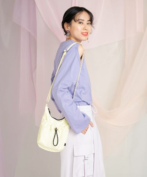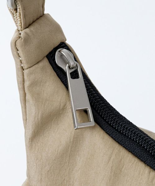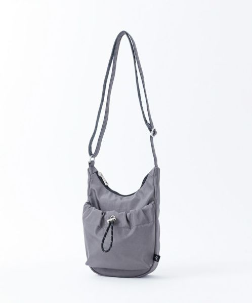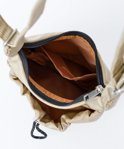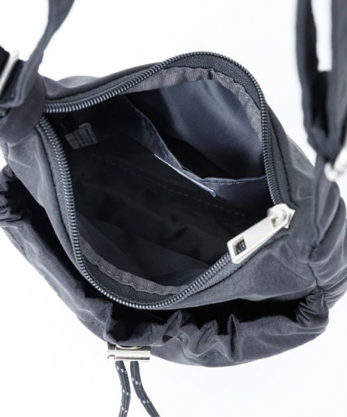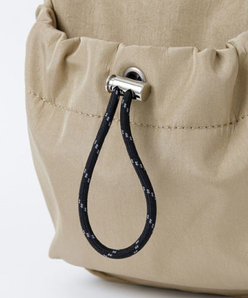 くしゅくしゅとしたフォルムが可愛い、トレンドのドロストポケットがポイントのカジュアルなシリーズ。生地はシャリっとした張り感と光沢のある撥水素材を使用してます。柔らかく軽量で、機能性もバッチリ◎長財布が縦に収まるサイズ感で、開口部はファスナー開閉式になっており安心。ちょっとした外出時に便利なアイテムです。