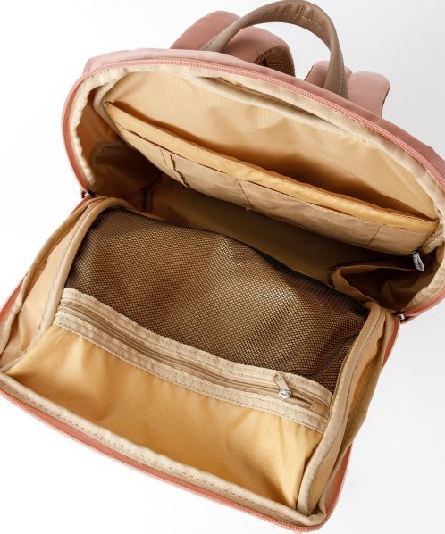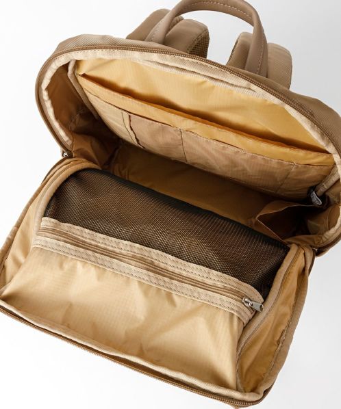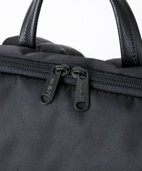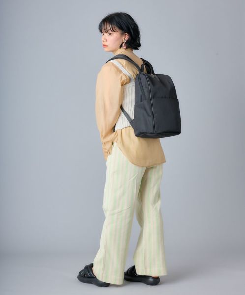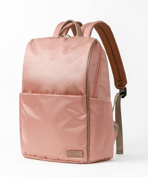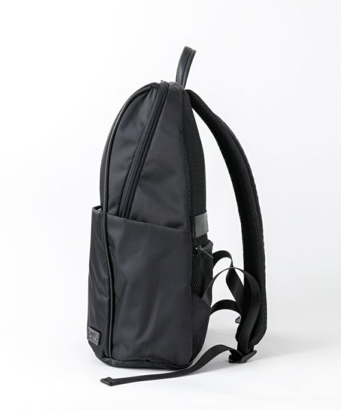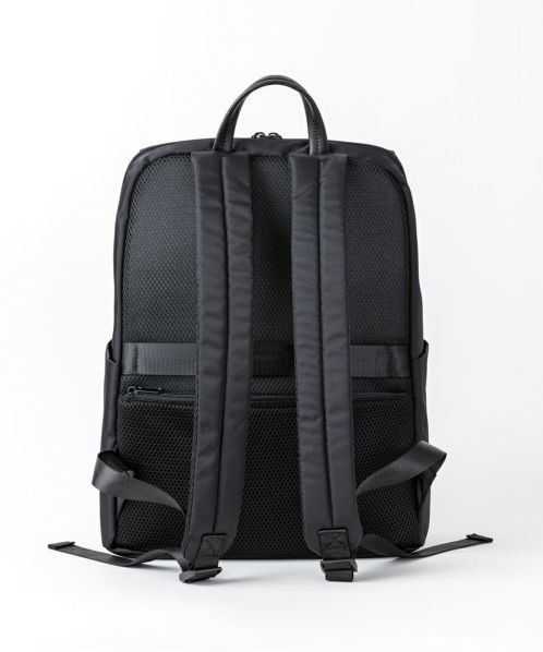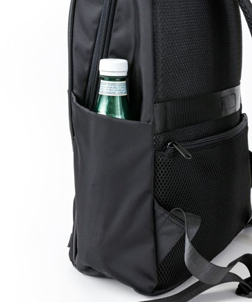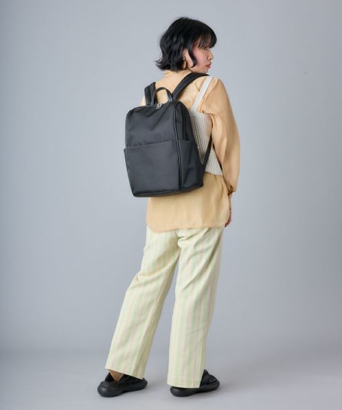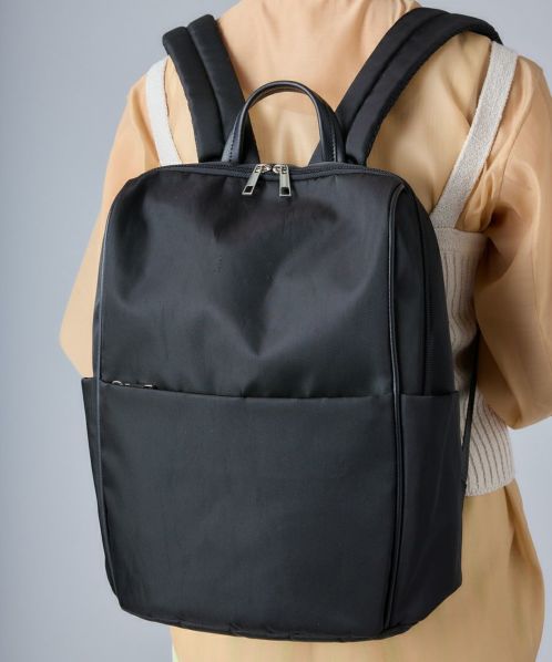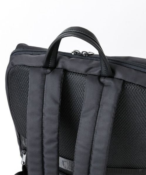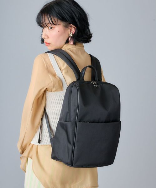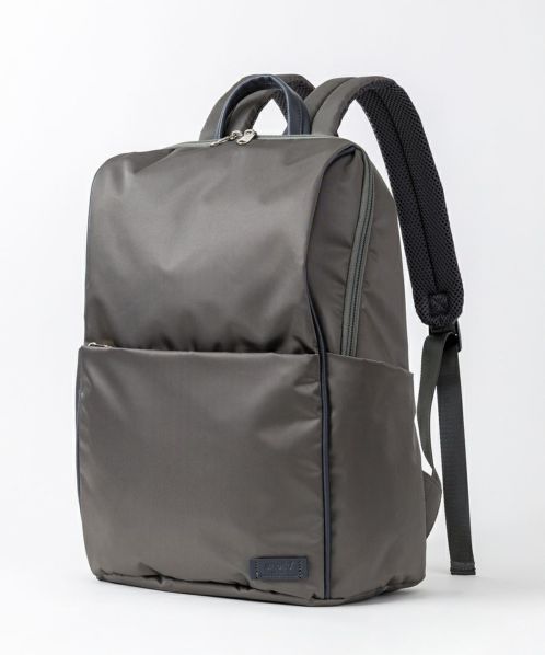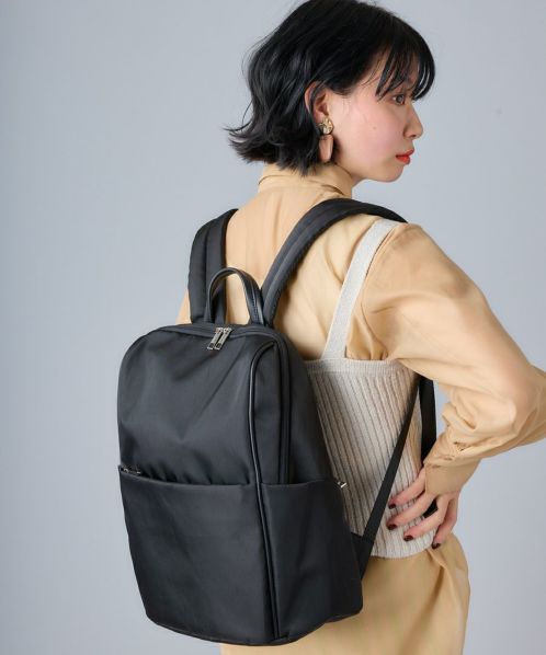 光沢感のあるポリエステルツイルにポイントで合皮を使用し、上質感のある印象に仕上げた多機能リュック。スリムな形状なので男女問わずすっきりとお持ちいただけます。両面はっ水・軽量仕様のため普段使い~通勤通学におすすめ。内側には新機能のティッシュポケットがあり、使用後は後ろのポケットへ。