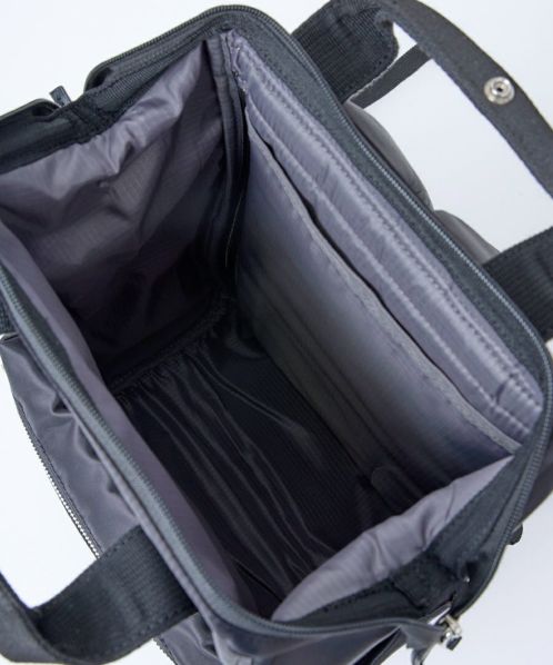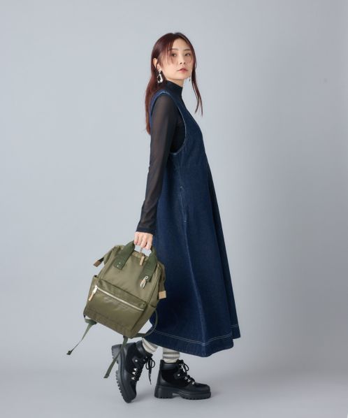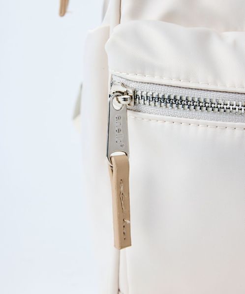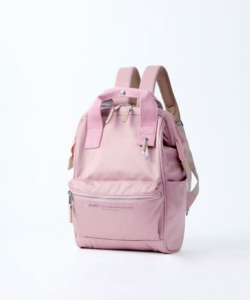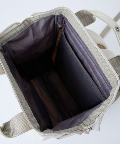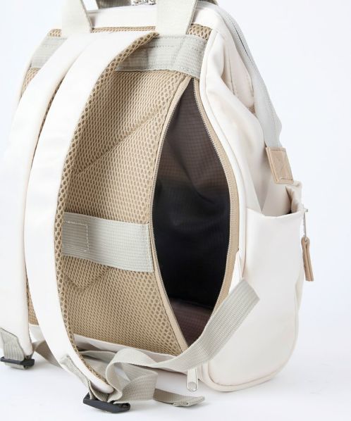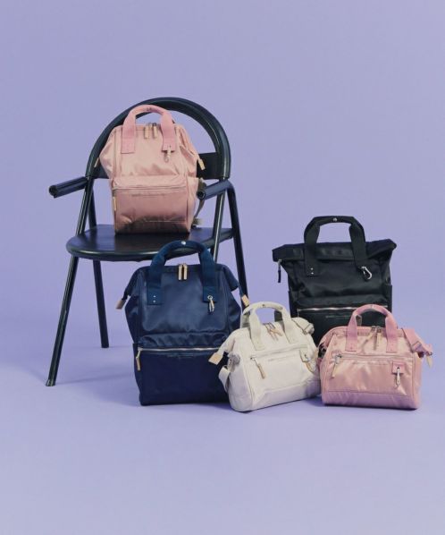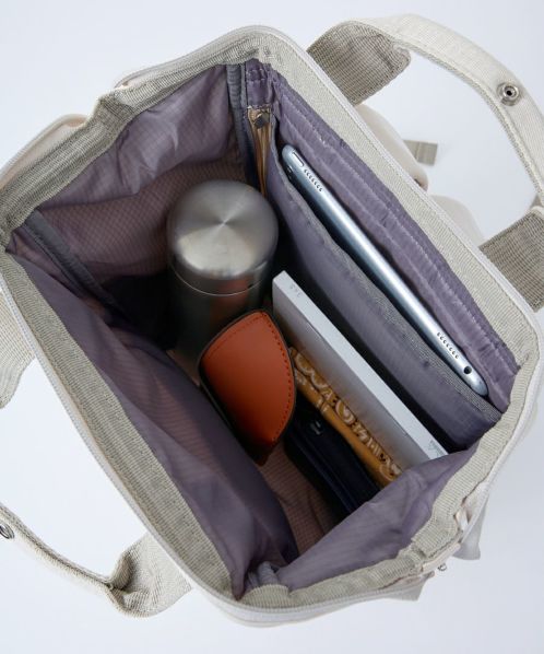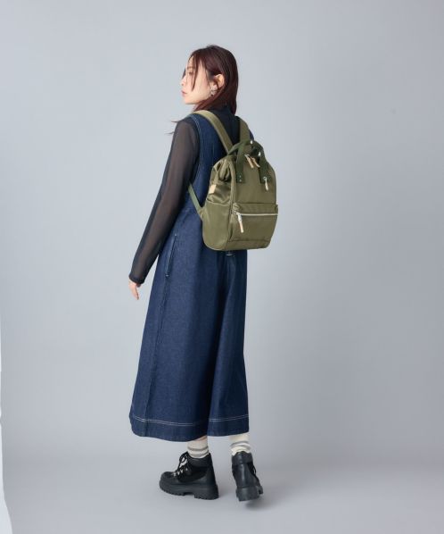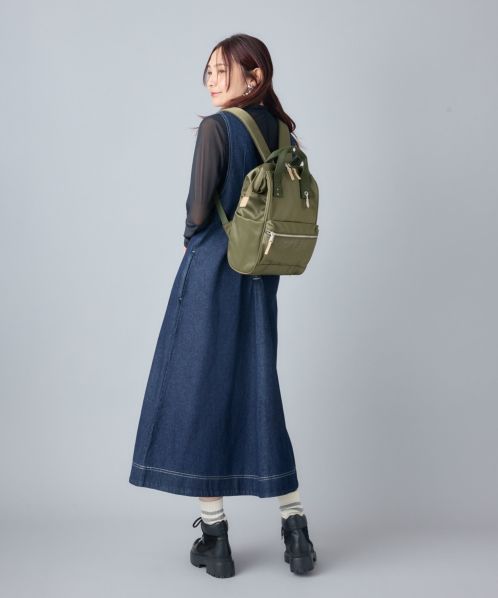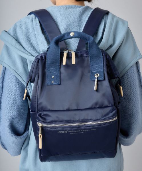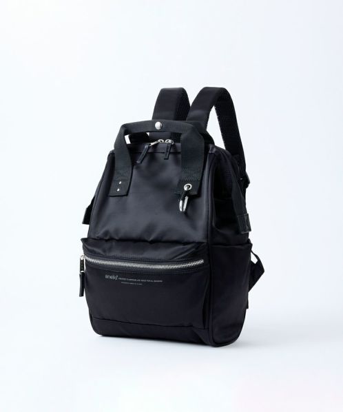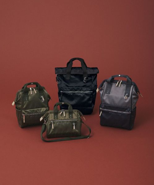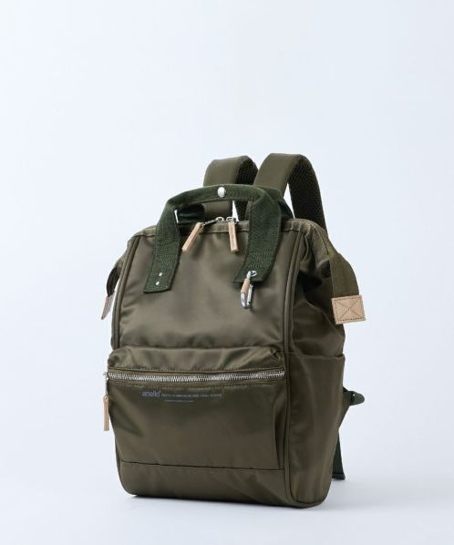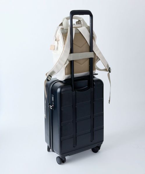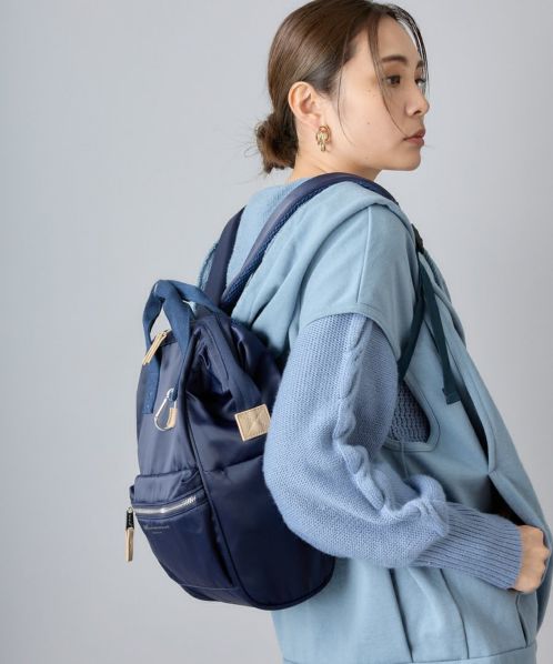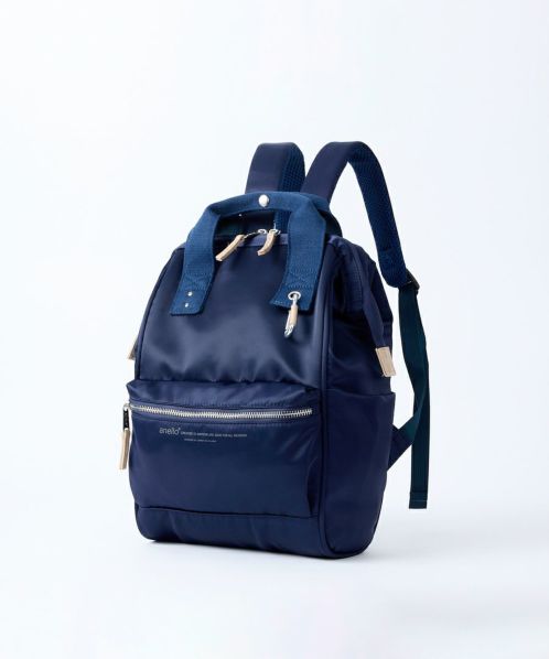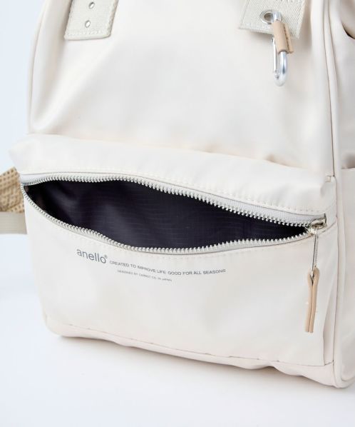 光沢感が美しいはっ水ナイロンの本体生地に同色コットン長テープを合わせ、高級感のあるシルバーファスナーをあしらった“ELEANOR”(エレノア)シリーズ。両面はっ水加工のため汚れが付きにくく、雨の日のお出掛けでも安心。フロントにあるカラビナにはリール付きパスケースやお気に入りのストラップを付けることができます◎スモールサイズの口金リュックはA4サイズが収納可能。背面にはキャリーオンテープが付いていて、旅行や出張の際に活躍します。スリムなシルエットですっきりとお持ちいただけます。