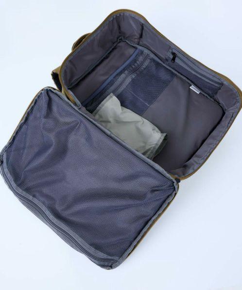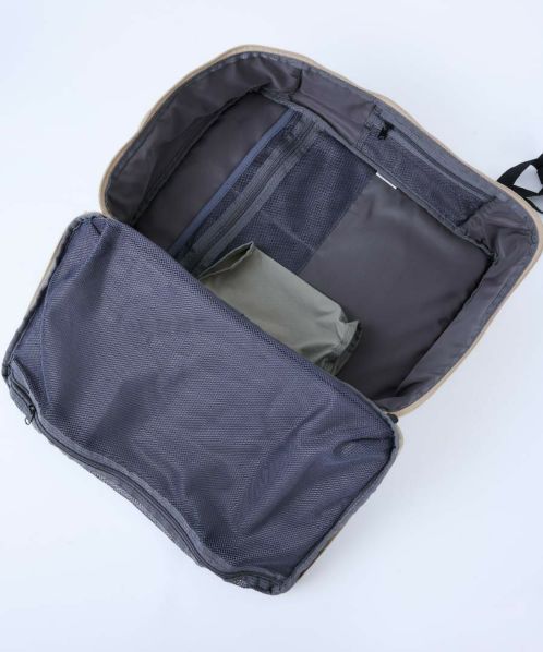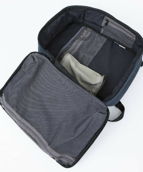 1泊2日の荷物をリュック一つでスマートに。ブランドのアイコニックとなる横開き仕様のリュック。大きなメッシュポケットは、荷物を可視化。立ったままでも荷物を取り出しやすいよう、ファスナーの始まり位置にもこだわっている。荷物が少なくても型崩れせず、自立する設計はどんな時もスタイリッシュ。