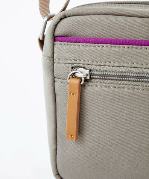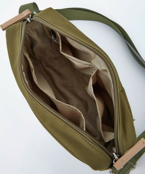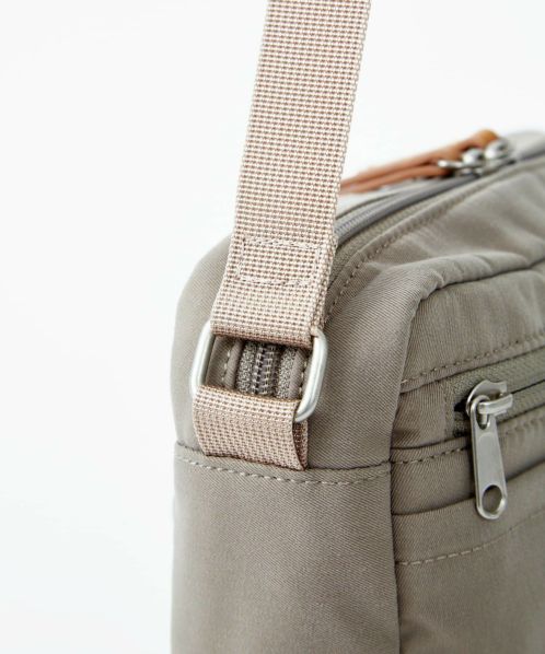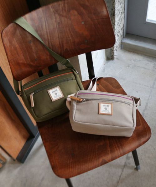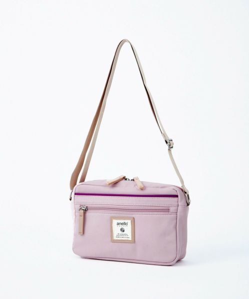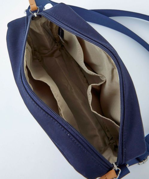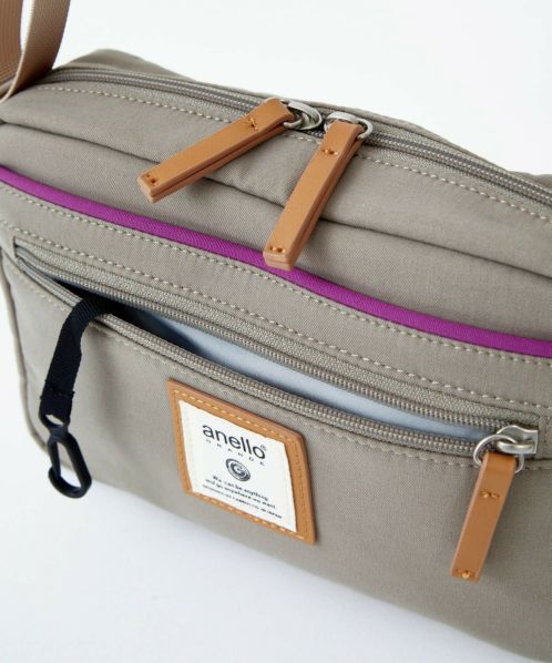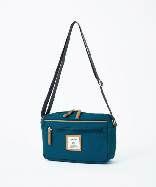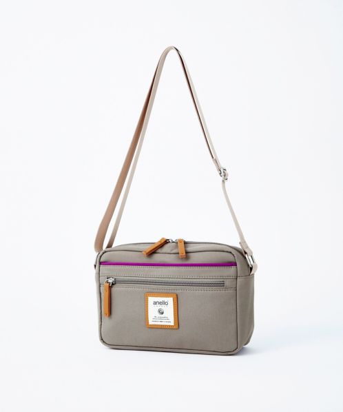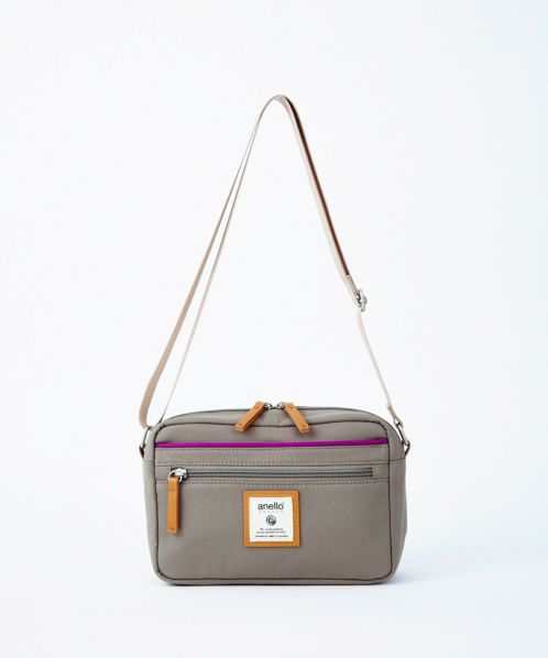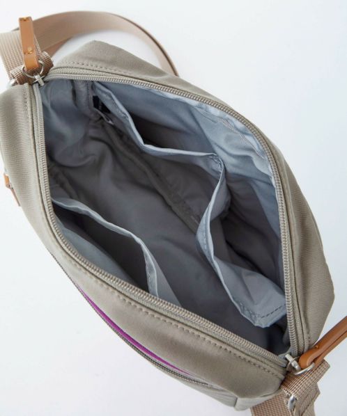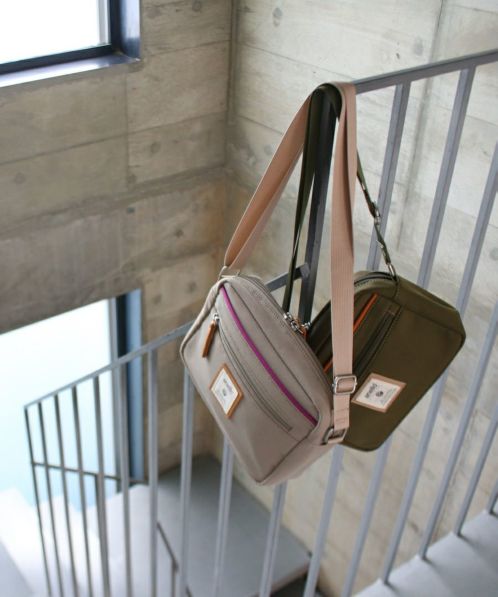 柔らかい手触りのツイルポリエステルを使用しました。合皮を使い合わせることにより高級感のある雰囲気に。コロンとした丸みのあるコンパクトなサイズながら、ポケットが7個も備わっています。