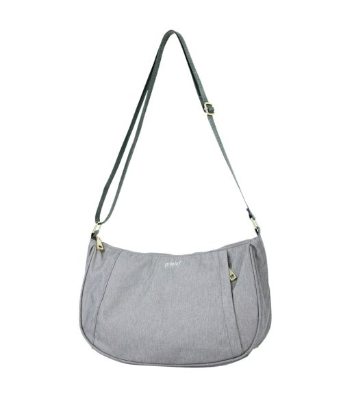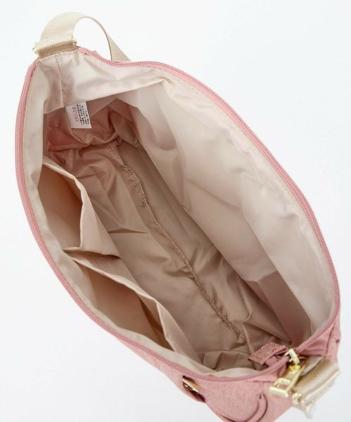 杢調ポリエステル生地にゴールド金具を使用し、カジュアル過ぎないデザインに仕上げました。内生地にも撥水加工を施しているので、内側も汚れにくい嬉しい仕様。A5サイズ収納可能でちょっとしたお出かけや買い物に最適です。