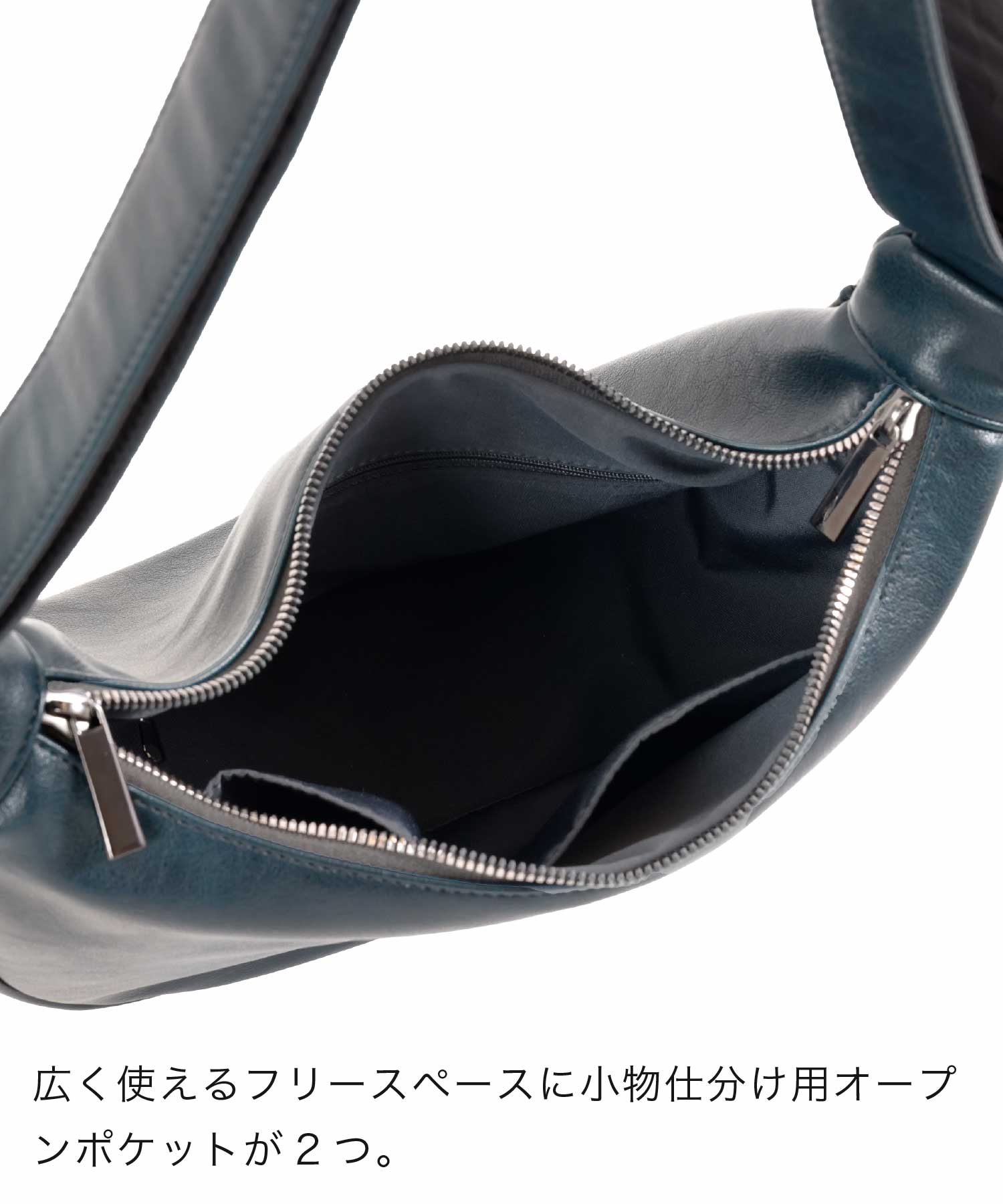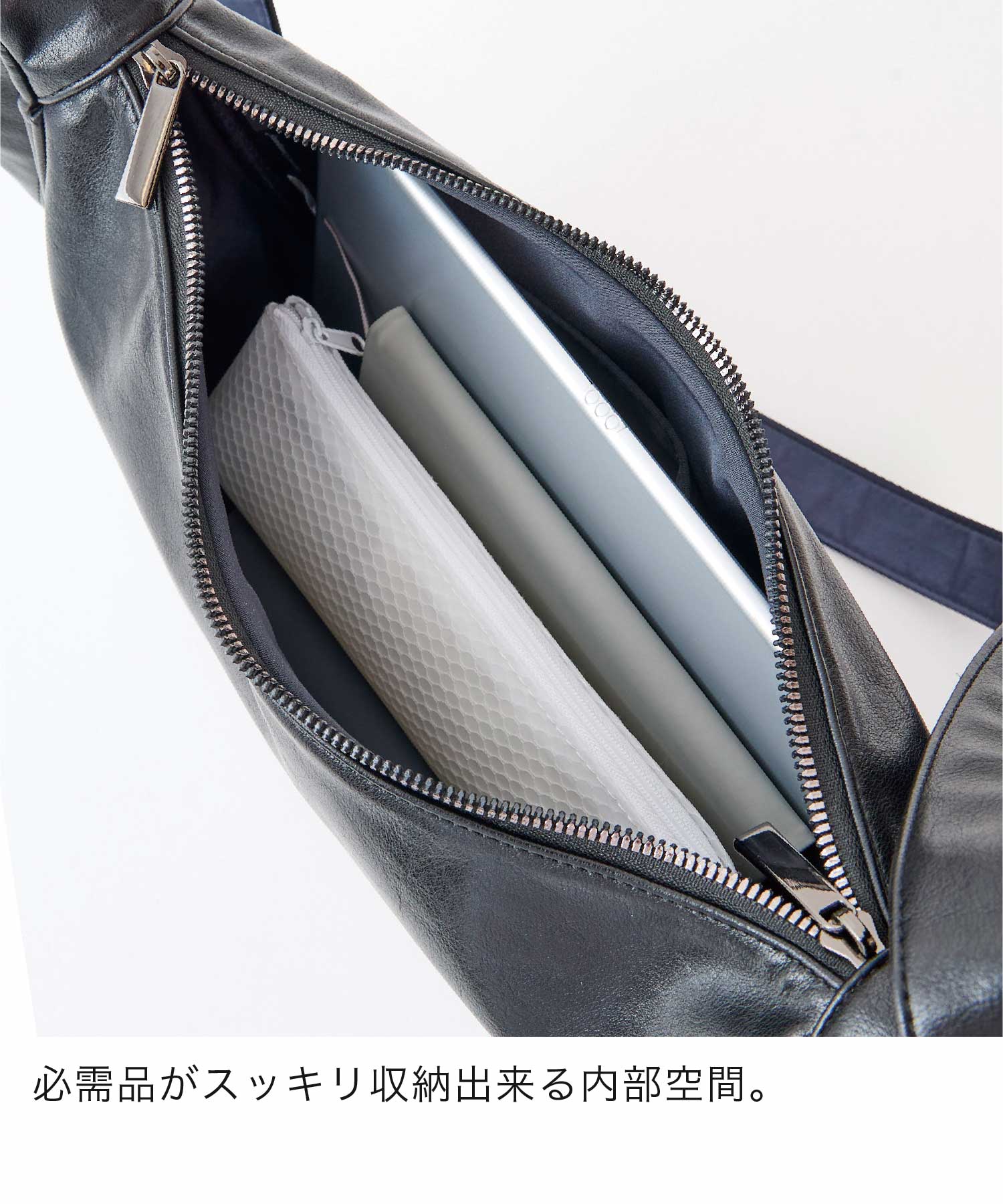 バッグの持ち手から本体までの流れるようなラインデザインで、肩から掛けた時でも形を崩さず身体に美しくフィットする。 皮革のような雰囲気でいて撥水性が高くシーンを選ばない。 長財布が入る程にマチが広いことで収納力が高く、自立する設計になっているので使用していない時でも存在感を発揮する。