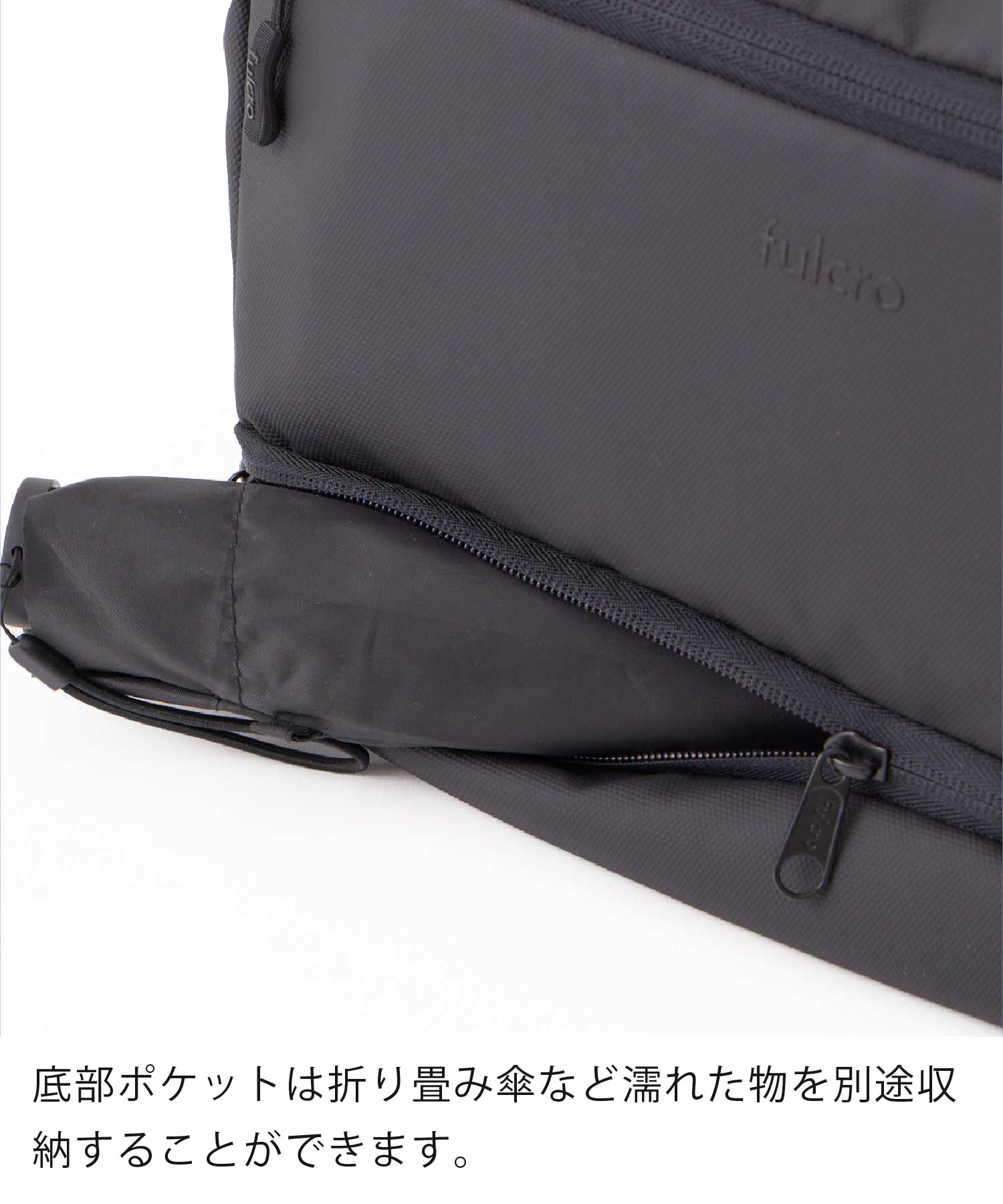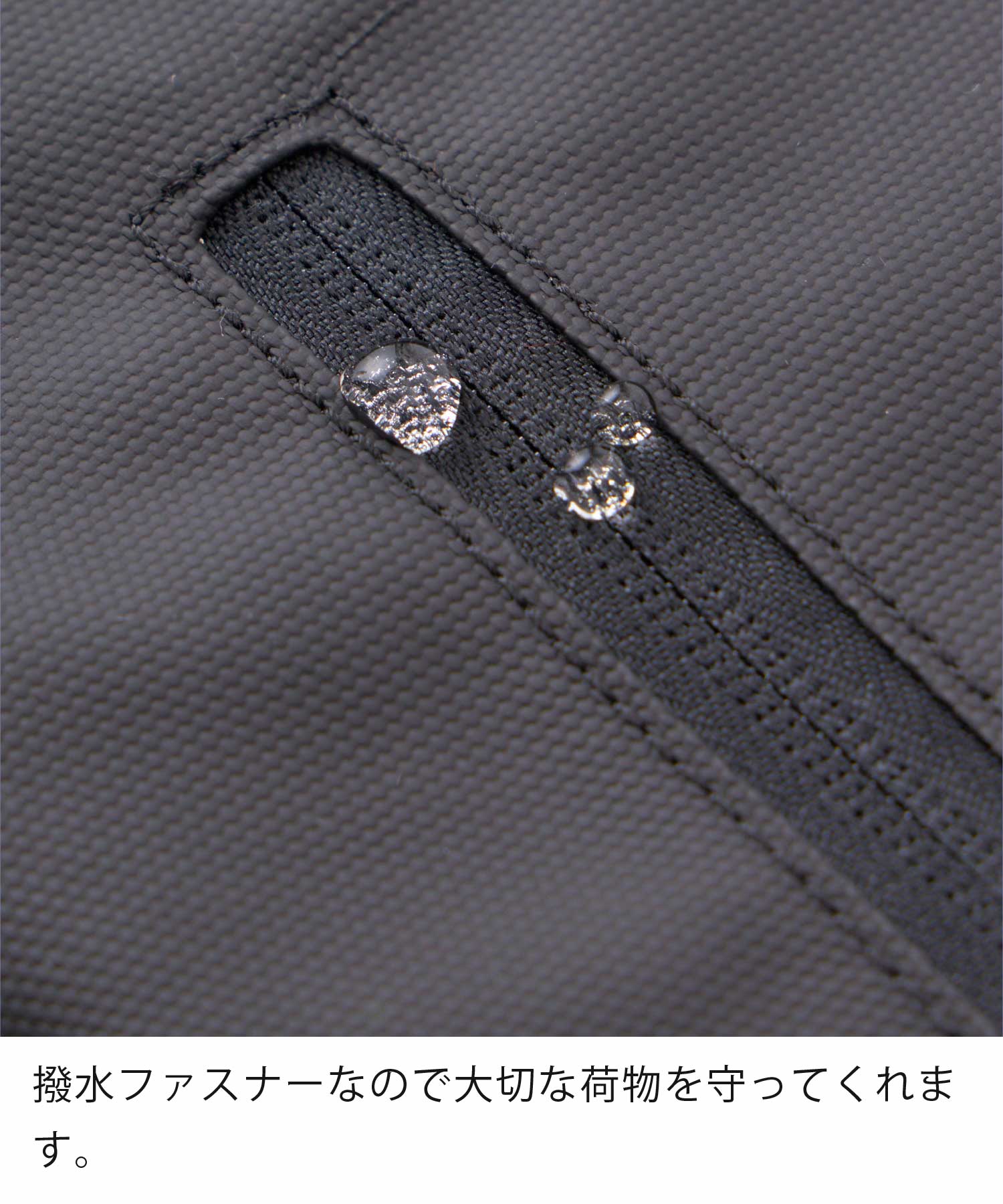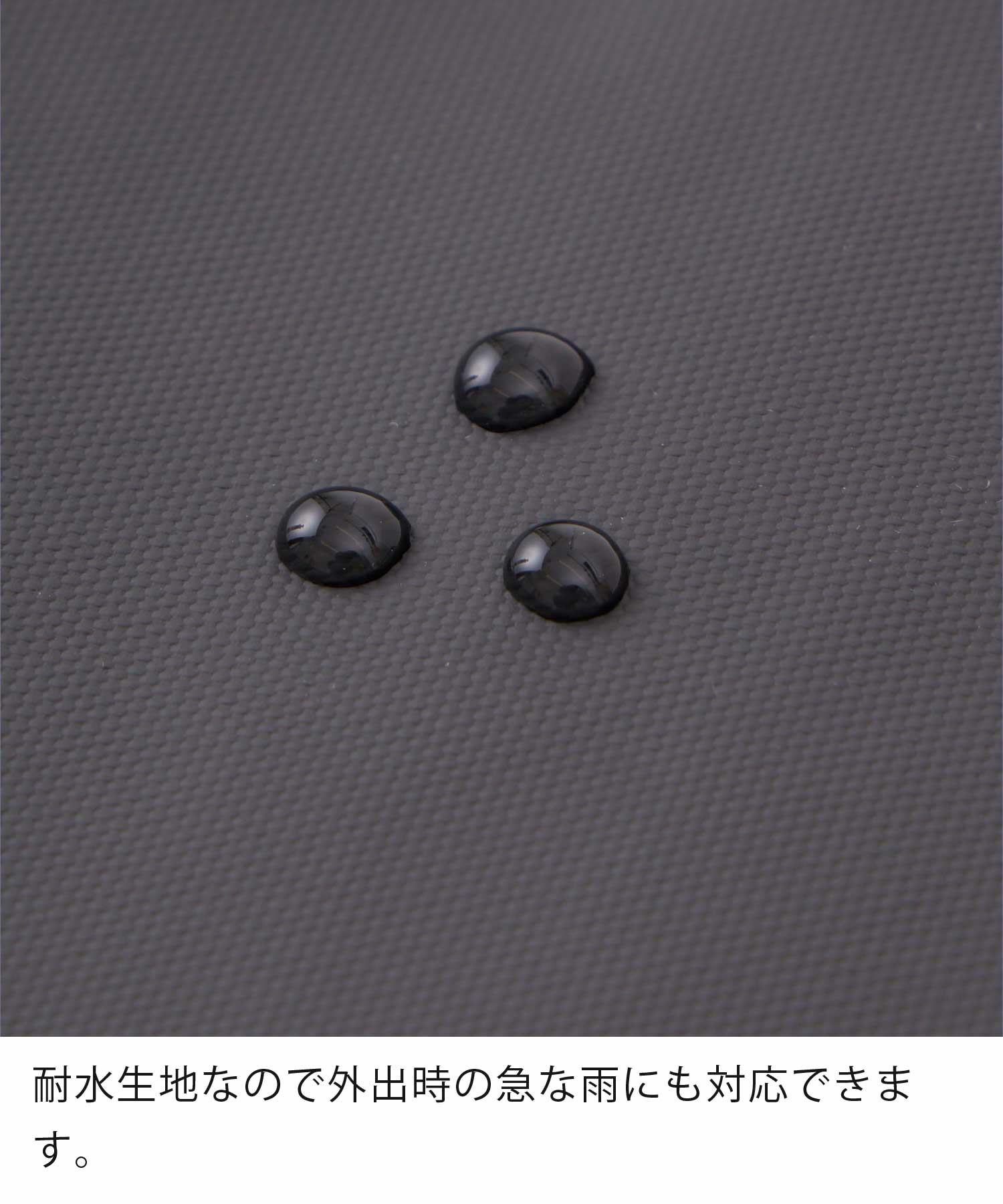 急な雨でも慌てない。 濡れた傘は下部の専用スペースへ、500mlペットボトルなら2本まで収納可能。 上層には大切な荷物を安全に。 2層構造のコンパートメント設計が荷物をしっかり分離。 生地、ファスナー、内装に撥水加工を施した、雨天対応の頼れる相棒。