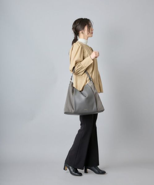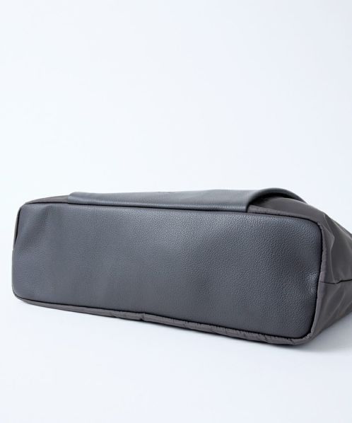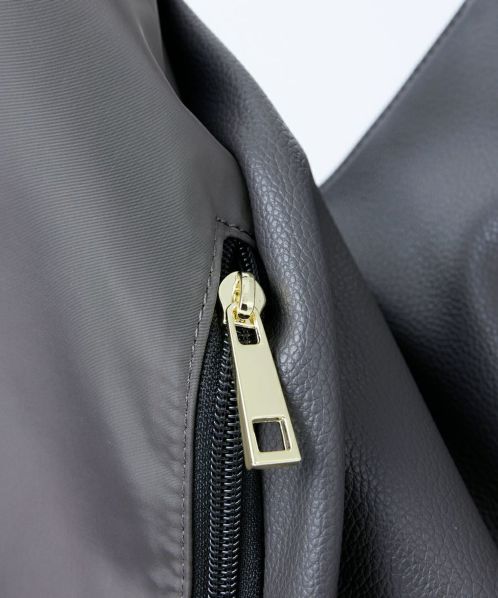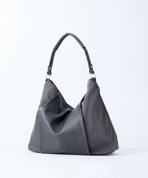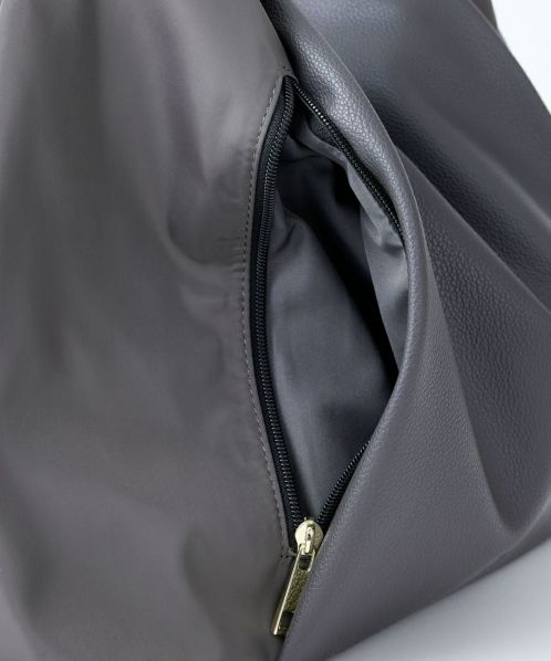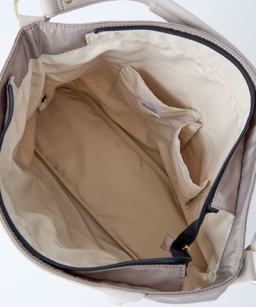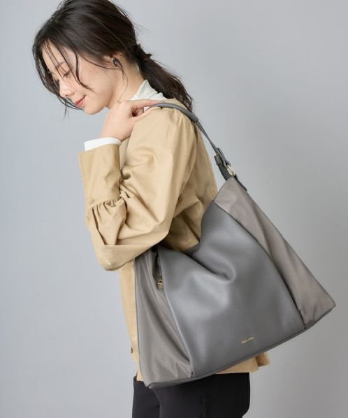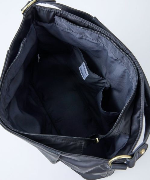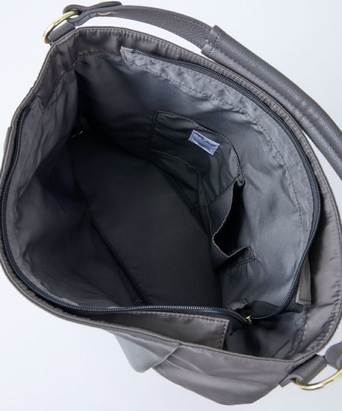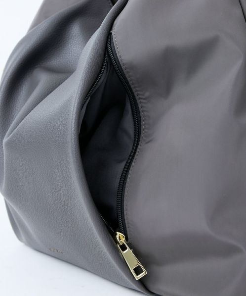 上品な光沢感のあるポリエステル素材とシボが型押しされたフェイクレザーの組み合わせが大人の雰囲気◎A4の大きなファイルも収納可能なので通勤・通学にも最適です。左右どちらの肩に掛けても使いやすい2つのフロントファスナーポケットがあるのが嬉しいポイント。