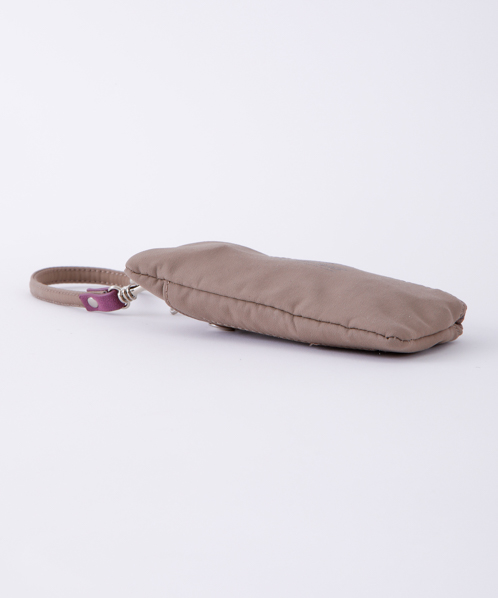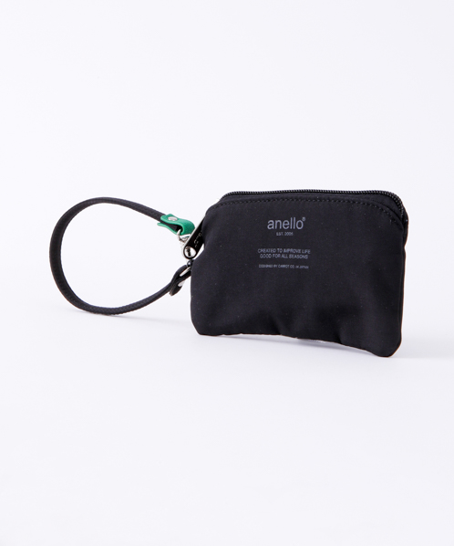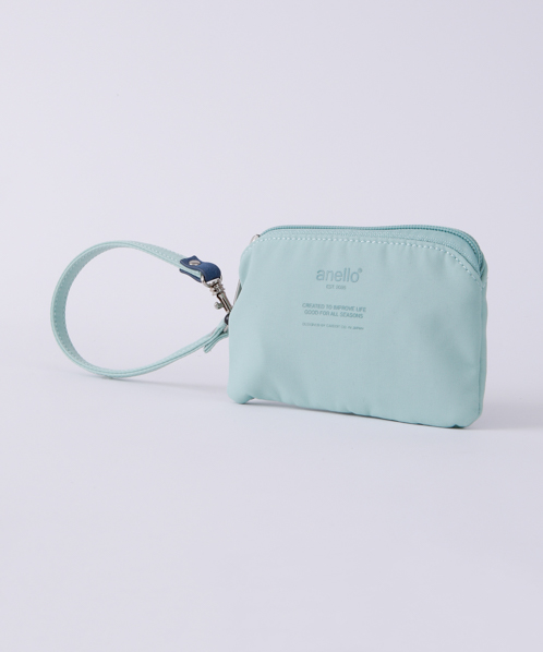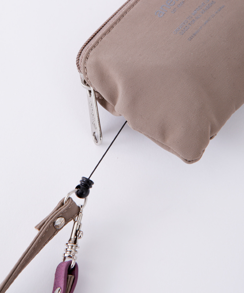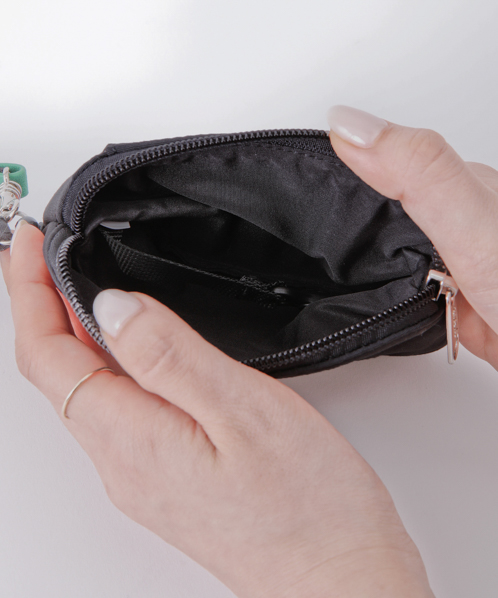 ハリのあるグログラン調ナイロンを使用したシンプルでベーシックなデザイン。スエードタッチ生地をカラーアクセントにしたカラビナパーツがポイント。コインケースとパスケースが合体し、便利なアイテム。リール付きでバッグに取り付けてもワンポイントになり、バッグにつけたままICカードなどのタッチができます。