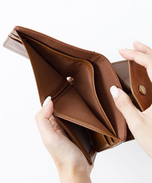 ホックを開けば一目で見える、楽見え、楽だしの秒財布。小銭入れが大きく開くので見つけやすいのも嬉しいポイント◎取り出しやすい切れ込みでカードの取りやすいのも魅力的。