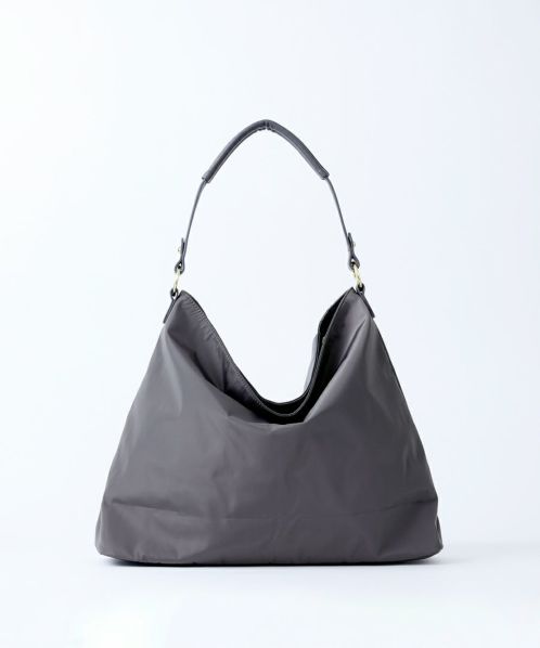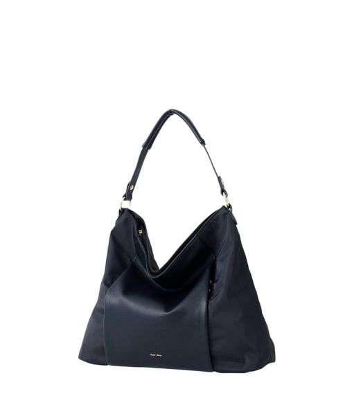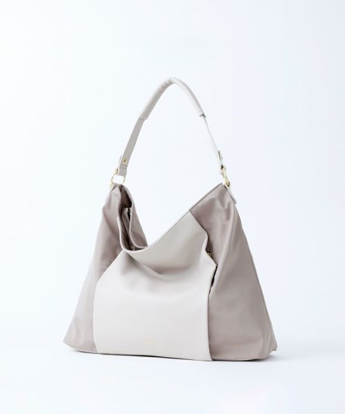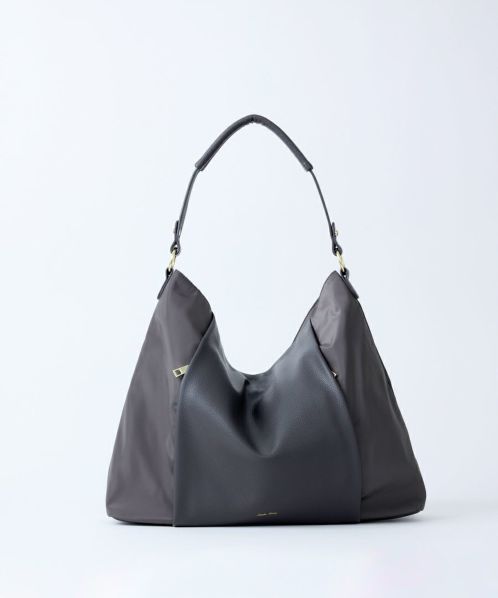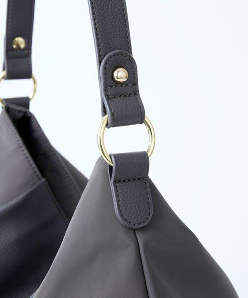 上品な光沢感のあるポリエステル素材とシボが型押しされたフェイクレザーの組み合わせが大人の雰囲気◎A4の大きなファイルも収納可能なので通勤・通学にも最適です。左右どちらの肩に掛けても使いやすい2つのフロントファスナーポケットがあるのが嬉しいポイント。