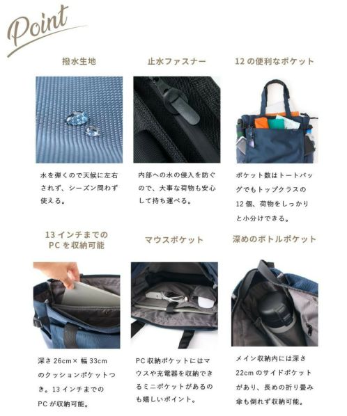“ こうだったらいいな。“お客様の声をぎゅっと凝縮した機能性たっぷりな『Cliente(クリエンテ)』シリーズ。性別・年齢問わずに幅広い層のお客様にお使いいただけるよう、ベーシックなデザインに仕上げました。両面撥水の生地を使用し、高級感ある合皮を使い合わせが落ち着きのある印象に。底鋲やリール型キーフックがあるので、お仕事などの毎日使いでも安心感があります。ポケットは12個あり、折り畳み傘やペットボトルを立てて収納できる縦型収納を完備。持ち手は長めに設計されているので、冬場の厚手アウターを着ても窮屈になりにくいのがうれしいポイント。