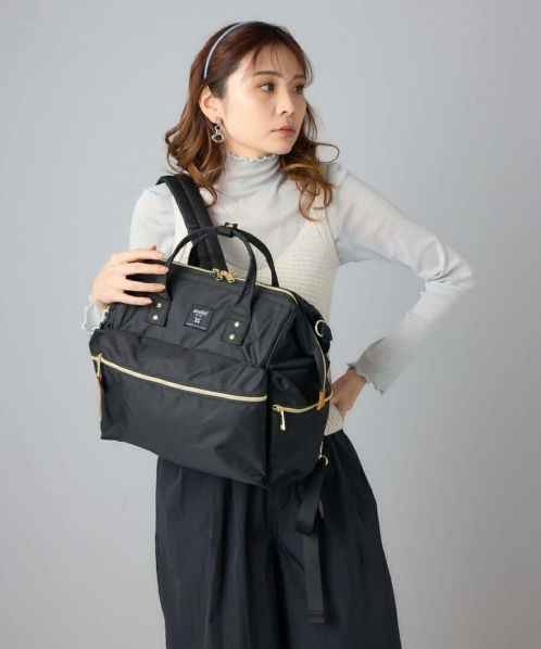 ペットボトルをリサイクルしたREPREVE®にはっ水加工を施し、anelloのアイコンシリーズを刷新。さらに、本革スエードからエコスエードに変更しました。アネラボに寄せられた“ボストン、ショルダー、リュックになる3WAYの口金バッグが欲しい”というお客様の声を形にしたアイテムです。