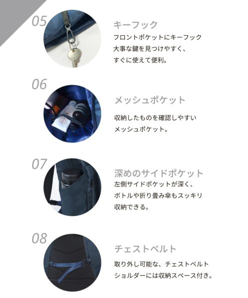 多機能リュックはフロントポケットにキーフック、メイン収納部の内ポケットは中身が見やすいメッシュポケット仕様など、充実した機能を持つスグレモノ。