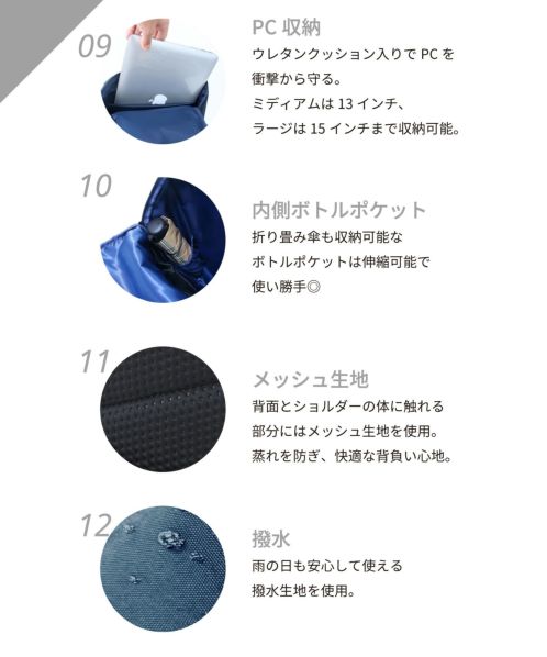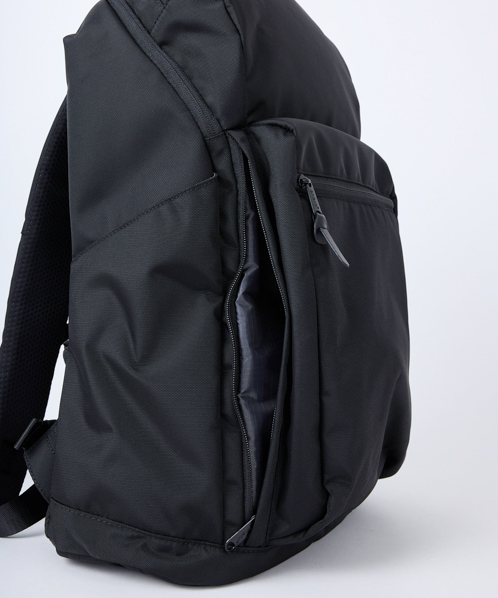 さらに斜めにカットされたサイドポケットは500mlのペットボトルが隠れ、後ろからの見え方がすっきりとした印象に見せることができ、シンプルながら細部にもこだわったリュック。