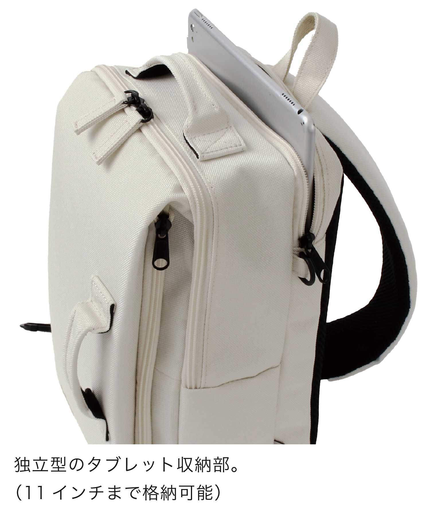 タブレット専用収納は底にもウレタンがあり角の衝撃にも強い。2層のフロントポケットは小物をスマートに使い分けが可能。荷物が少なくても型崩れせず、自立する設計でスタイリッシュ。