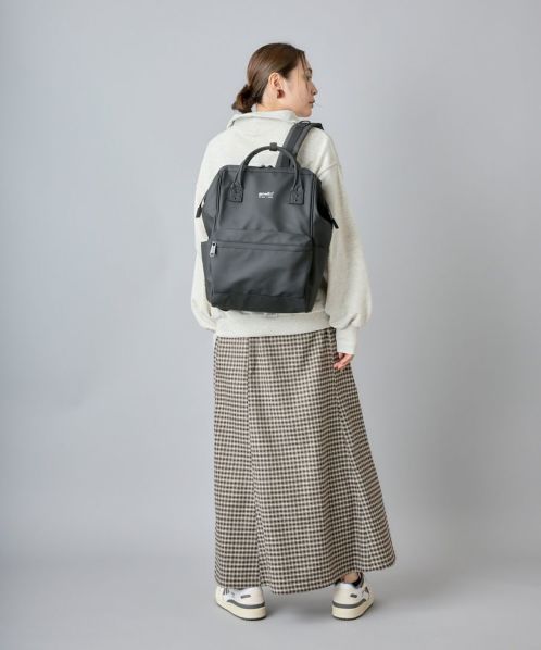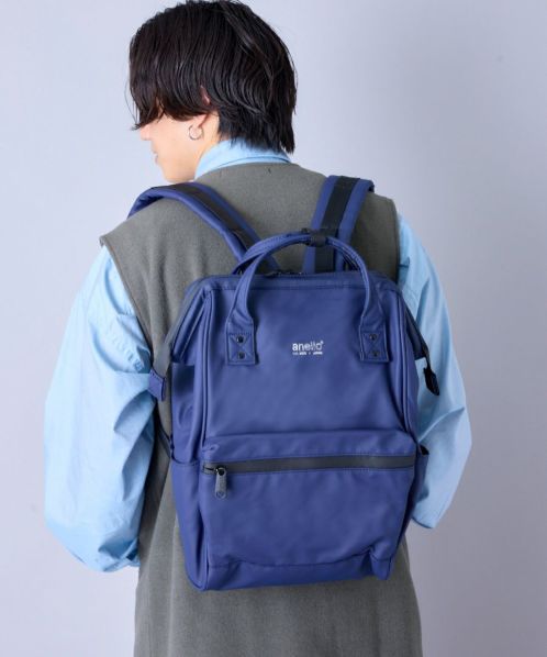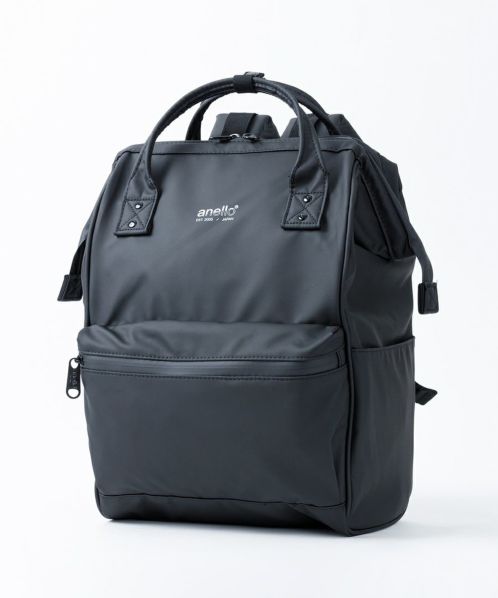 水を通しにくい生地を使用した耐水シリーズ。カラーリングとシンプルなデザインで、シーンや好みに合わせてお使いいただけます。anelloのアイコンバッグである口金を使用したレギュラーサイズのリュック。13インチのPCが収納可能で、セキュリティーポケットやキャリーオンテープなど充実した機能を搭載。普段使いだけでなく出張などのビジネスシーンにも◎