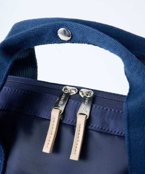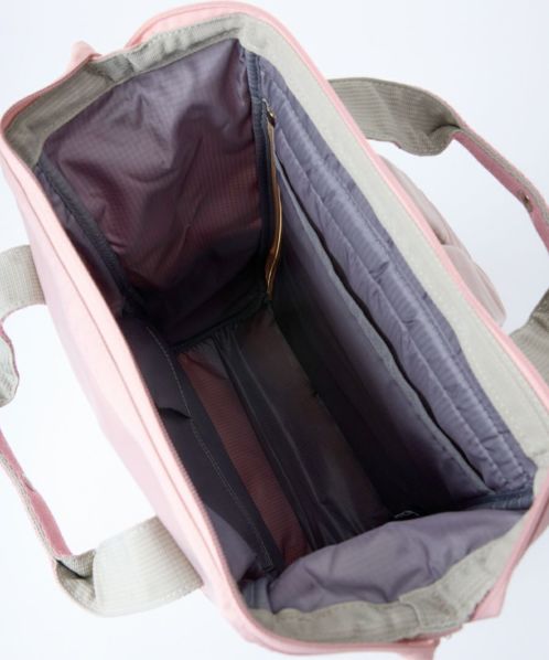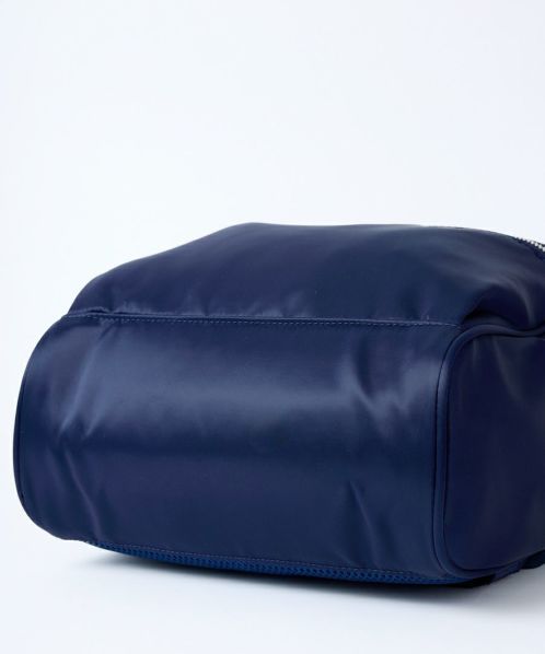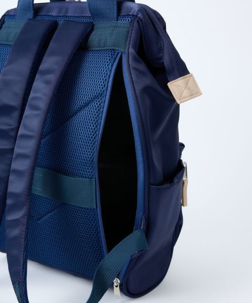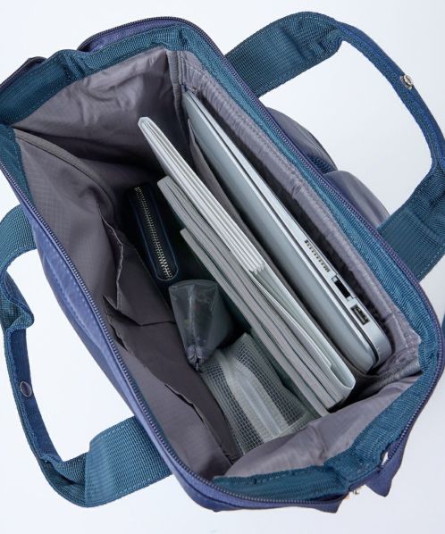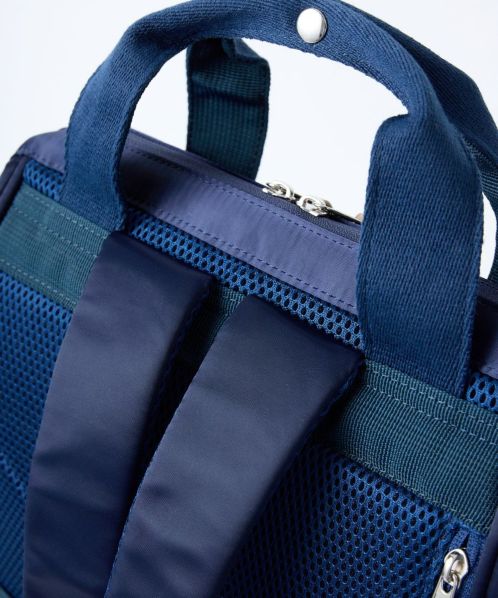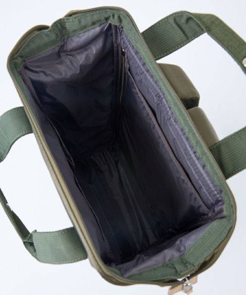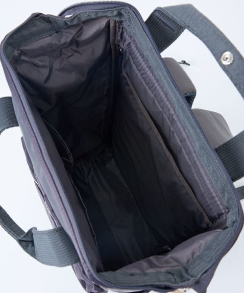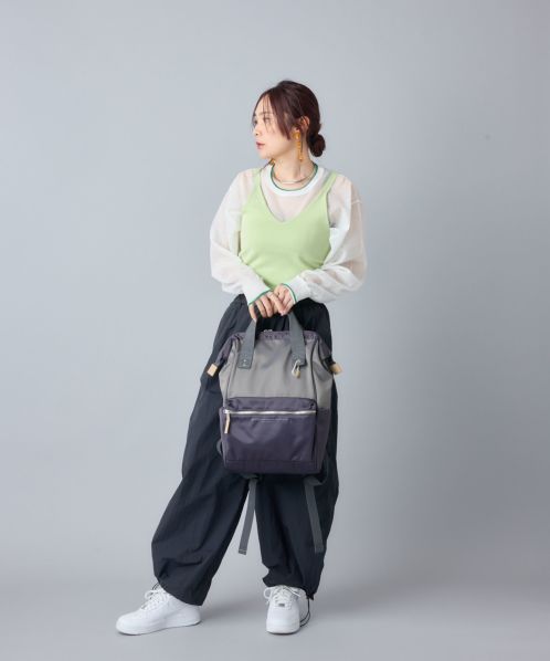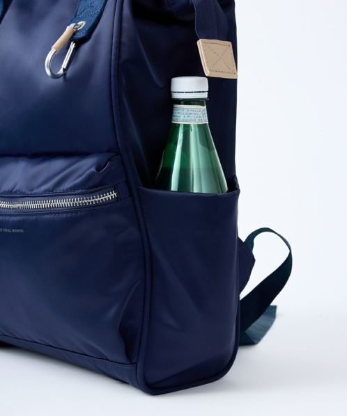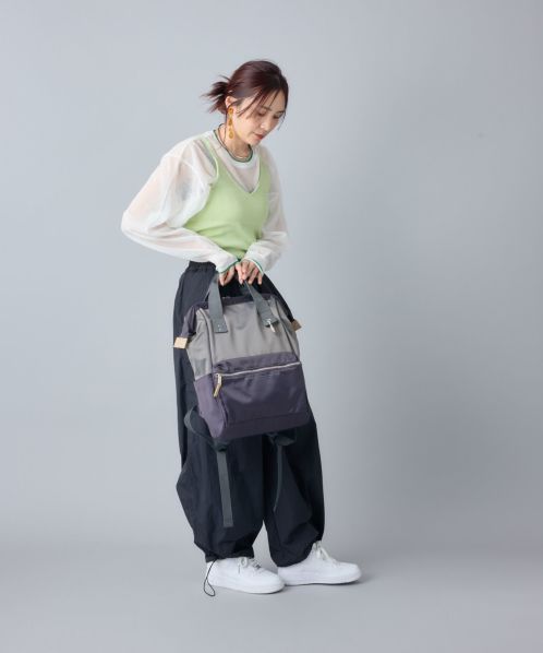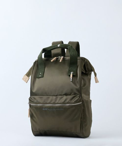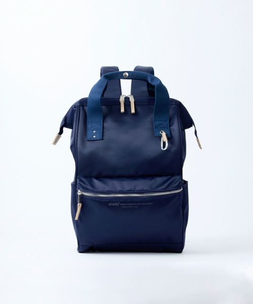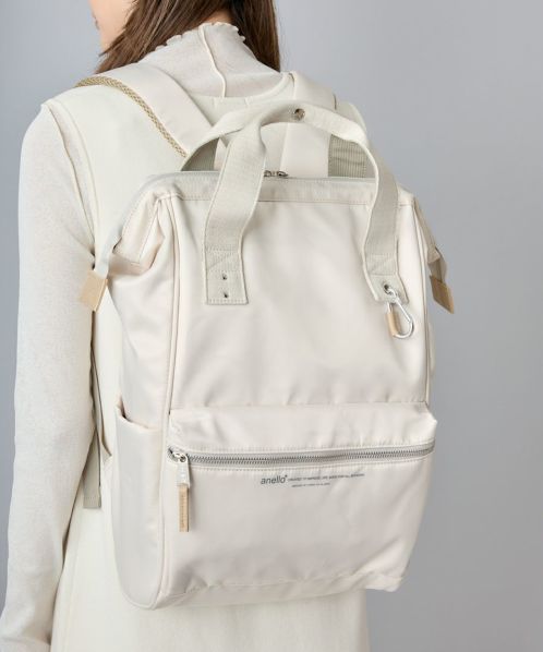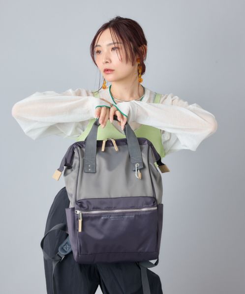 光沢感が美しいはっ水ナイロンの本体生地に同色コットン長テープを合わせ、高級感のあるシルバーファスナーをあしらった“ELEANOR”(エレノア)シリーズ。両面はっ水加工のため汚れが付きにくく、雨の日のお出掛けでも安心。フロントにあるカラビナにはリール付きパスケースやお気に入りのストラップを付けることができます◎aレギュラーサイズの口金リュックは13インチのPCが収納可能。背面にはキャリーオンテープが付いていて、旅行や出張の際に活躍します。スリムなシルエットですっきりとお持ちいただけます。