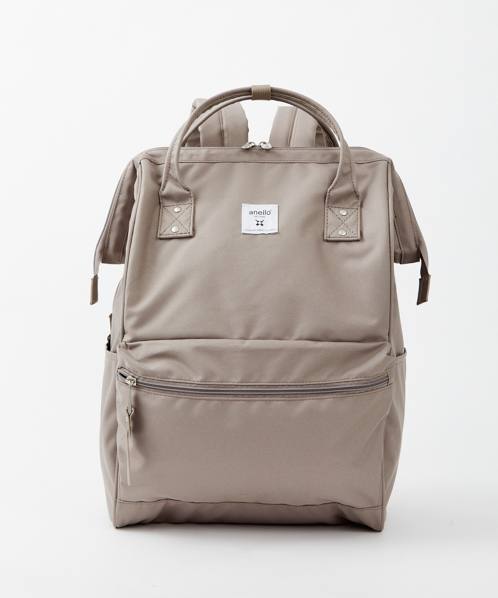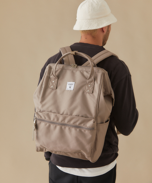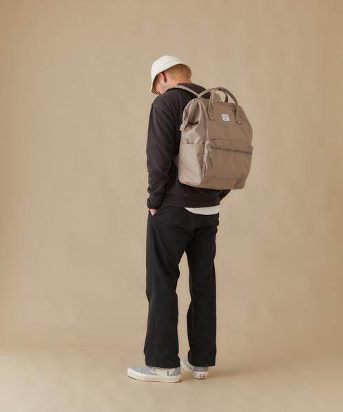 ファスナーや使い合わせの素材は本体カラーと同色に。金具カラーもシルバーにし、落ち着いた印象に仕上げました。また、今までになかったグレーベージュの色を新たに作成。開口部が口金仕様で、大きく開くので荷物の出し入れが楽々です。背面には貴重品を収納できるセキュリティーポケットと本体収納へ直結するファスナー付き。22L収納できる大きめ容量なので、幅広いシーンで活躍すること間違いなし。機能性と使いやすさの備わった、他にはない特別感の詰まったアイテムです!