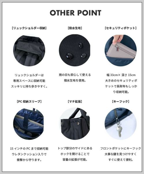 “ こうだったらいいな。“お客様の声をぎゅっと凝縮した機能性たっぷりな『Cliente(クリエンテ)』シリーズ。性別・年齢問わずに幅広い層のお客様にお使いいただけるよう、ベーシックなデザインに仕上げました。3wayリュックはポケットが多く収納力抜群、メイン収納の開口部はサイドのボタンを外すことで大きく開き、荷物が増えた時も安心です。リュックのショルダーは使わない時は専用の収納ポケットがあるので、シンプルながら細部にもこだわり、普段使いからお仕事バッグとしても幅広シーンで活躍します。