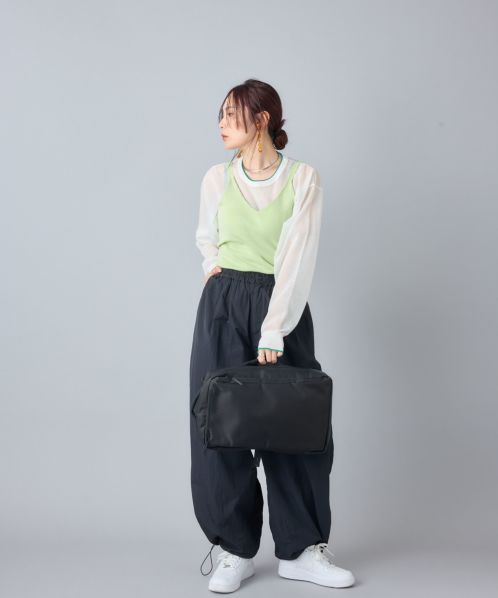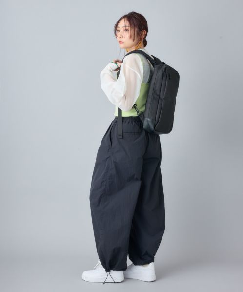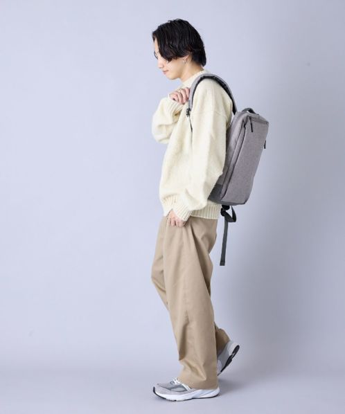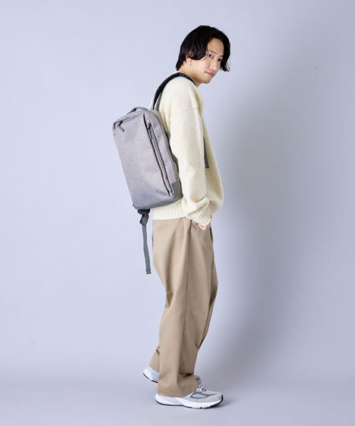 ヘリンボーン生地に合わせたBONEシリーズ。10ポケット、撥水加工、A4サイズ、PC収納、キャリーオンなど嬉しい機能が満載◎背面ショルダーをポケットに仕舞えば手持ち使いも可能な2WAY仕様。薄マチで電車の中でもかさばらないデザインが使いやすい◎