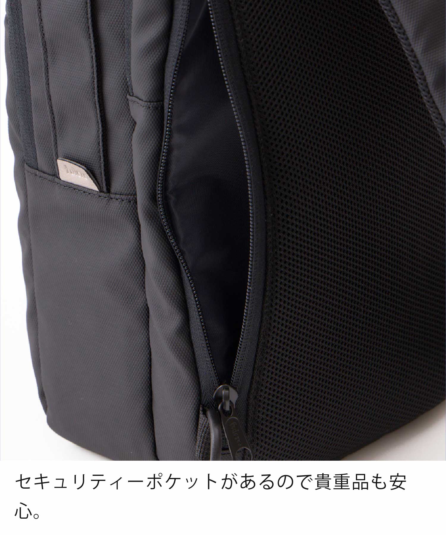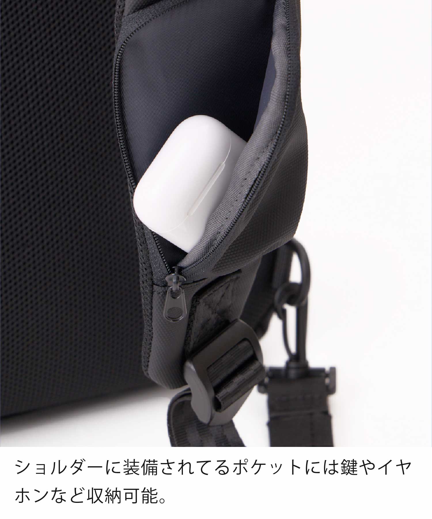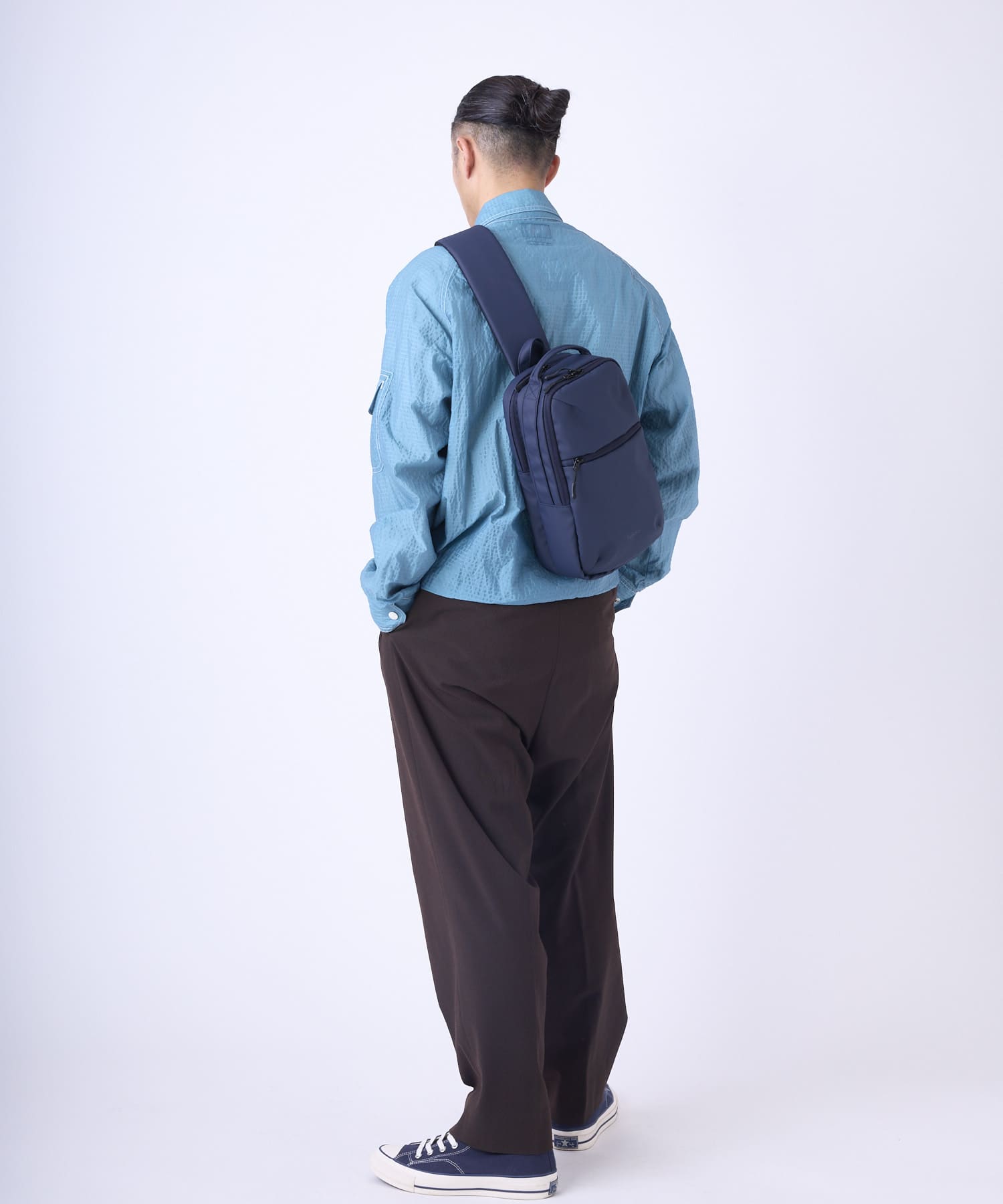街中での移動も、このバッグと一緒ならストレスフリー。 ショルダーのポケットから鍵やカードをサッと取り出せる。 タブレットは独立ポケット、貴重品は背面のセキュリティポケットへ。 耐水生地、撥水ファスナーテープで突然の雨も慌てない。 身軽な移動を叶える、俊敏な相棒。