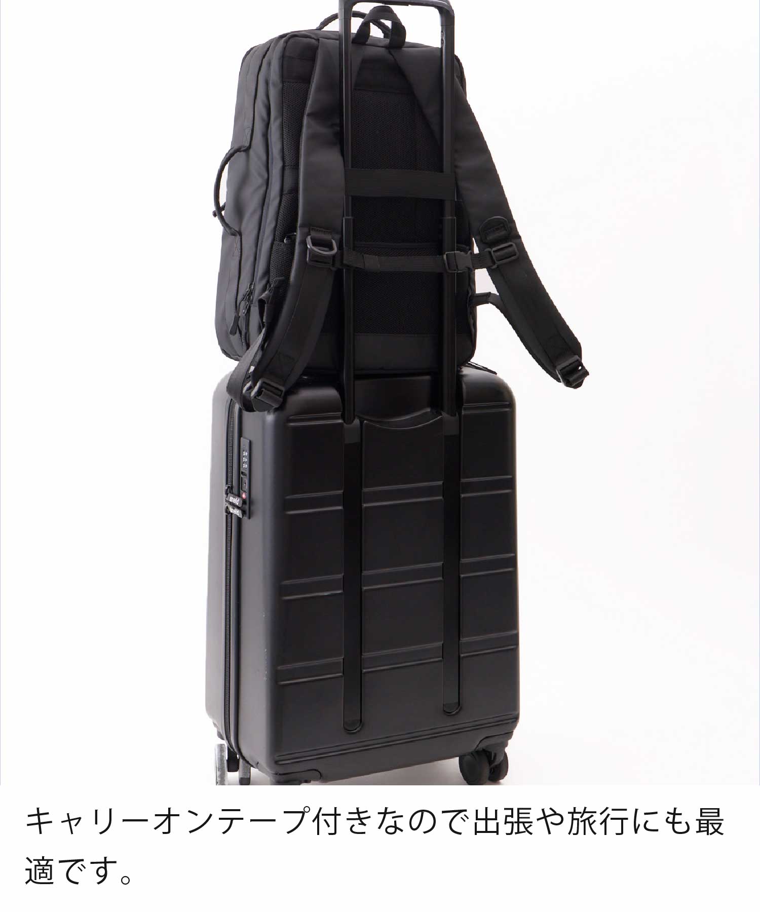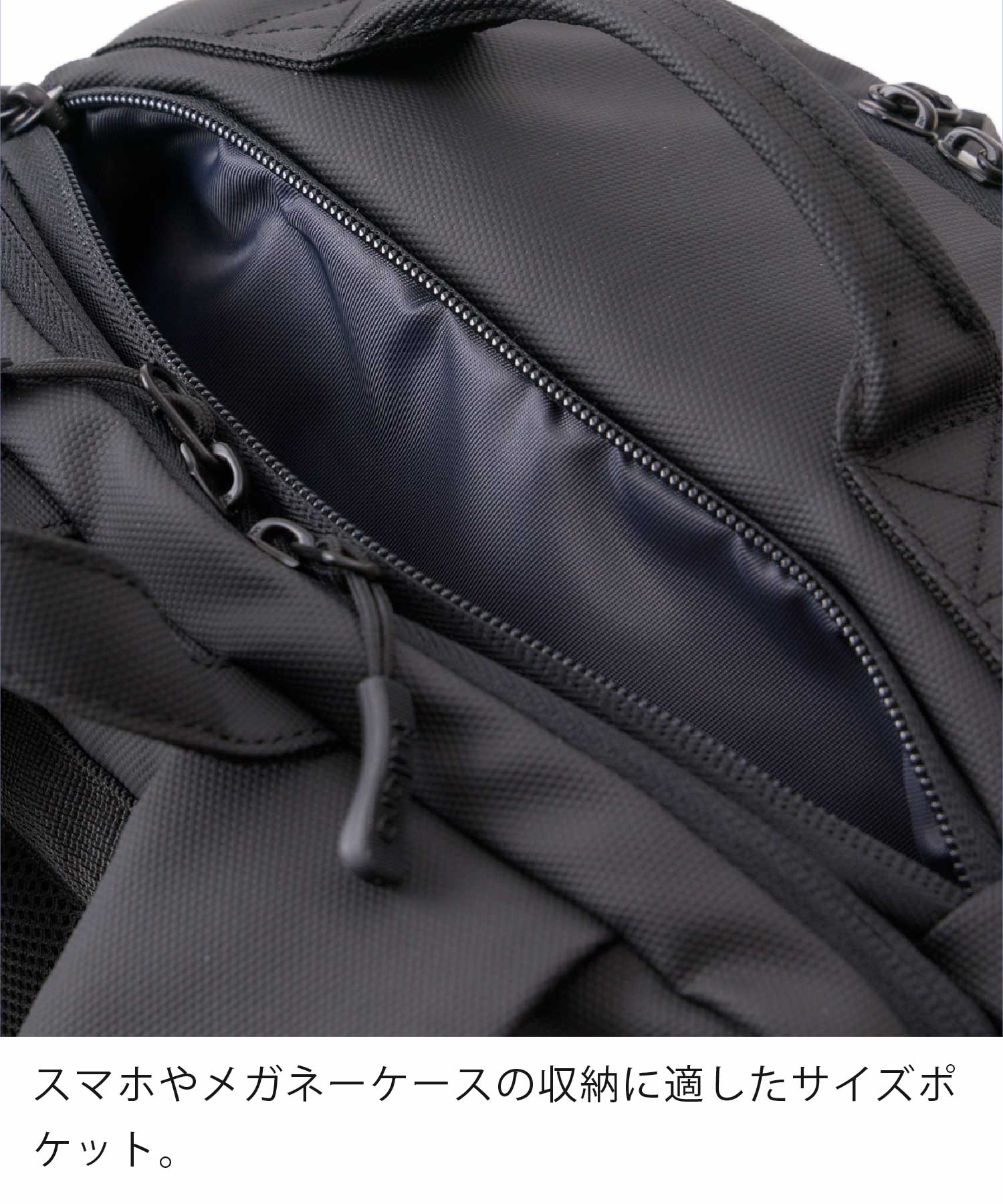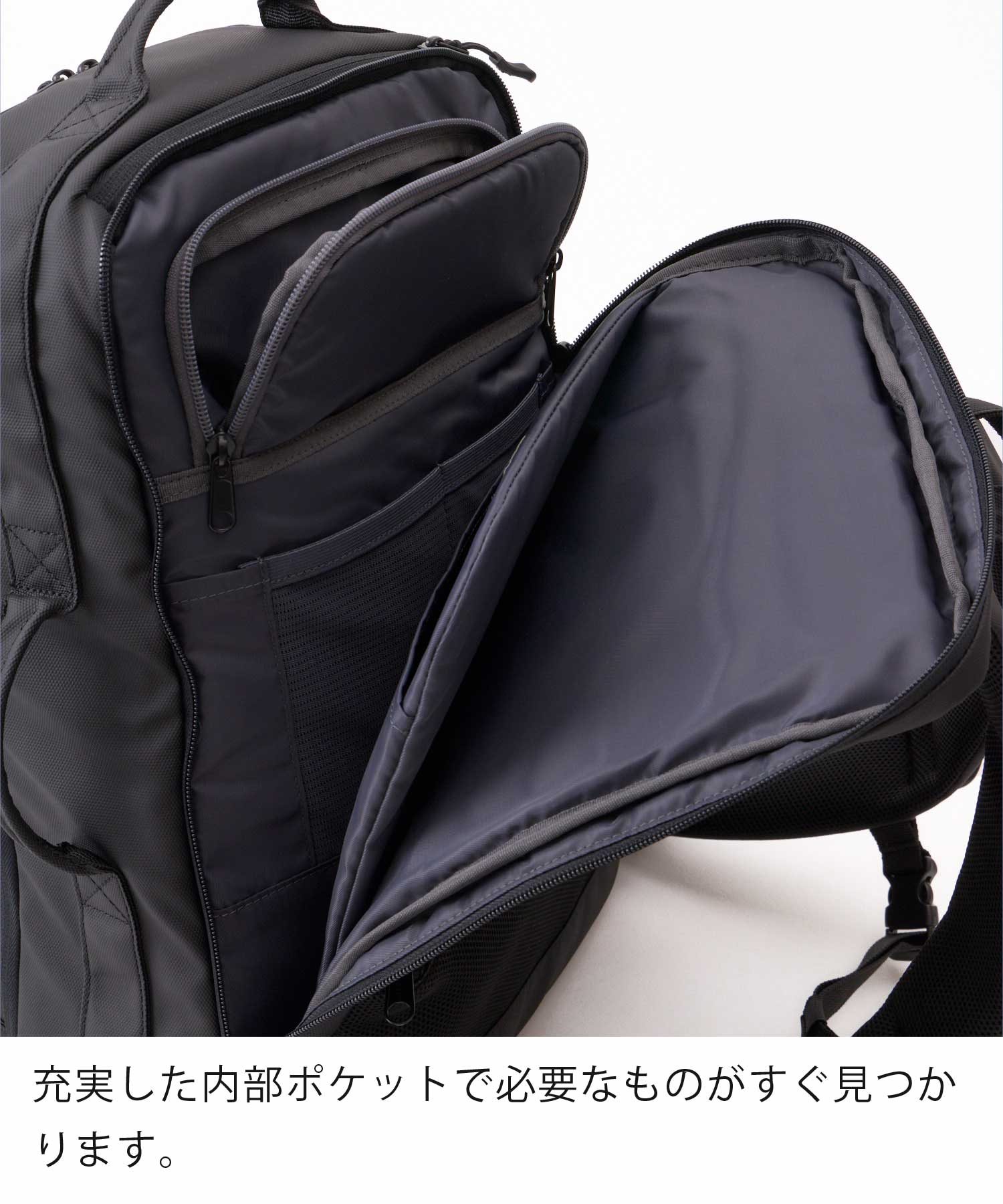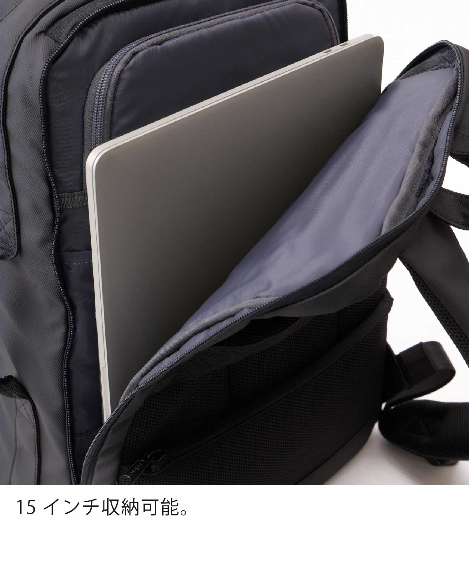 場所を選ばないスタイル。 オフィスでも、カフェでも、移動中でも。 ガジェット整理スペースが15インチまでのPC、タブレット、充電器などを効率的に収納。 充実した内部ポケットで、必要なものがすぐ見つかる。 耐水生地、撥水ファスナーテープで突然の雨も慌てない。 どんなシーンにも適応するバックパック。