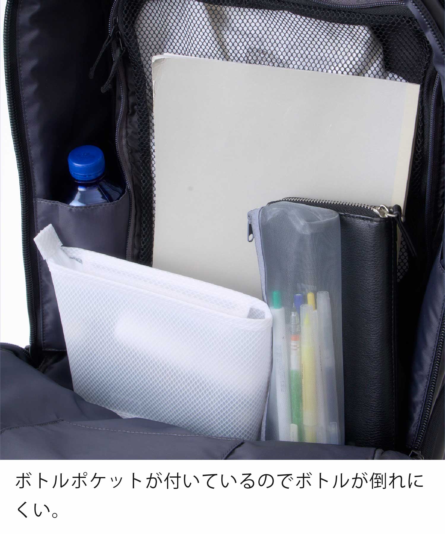 シーンを選ばない、心強さ。 総容量45Lの2層式バックパック。 上部31Lのメイン収納と下部14Lの独立収納で、シューズや濡れた荷物も気兼ねなく収納できる。 スムースマットな耐水生地で、急な雨にも慌てない。 機内持ち込みサイズだからスーツケース代わりにも。 旅も、ジムも、防災の備えも、これひとつで対応。 10ポケットで、どんなシーンでも整然と、スマートに。