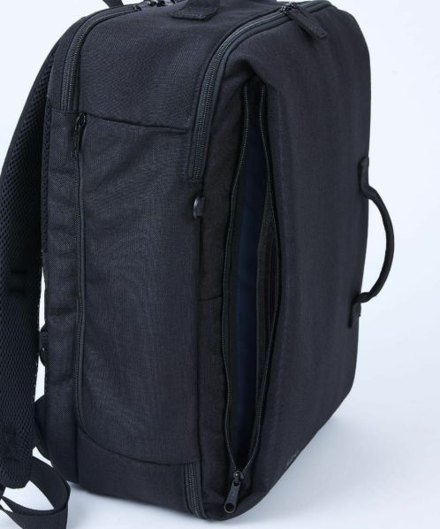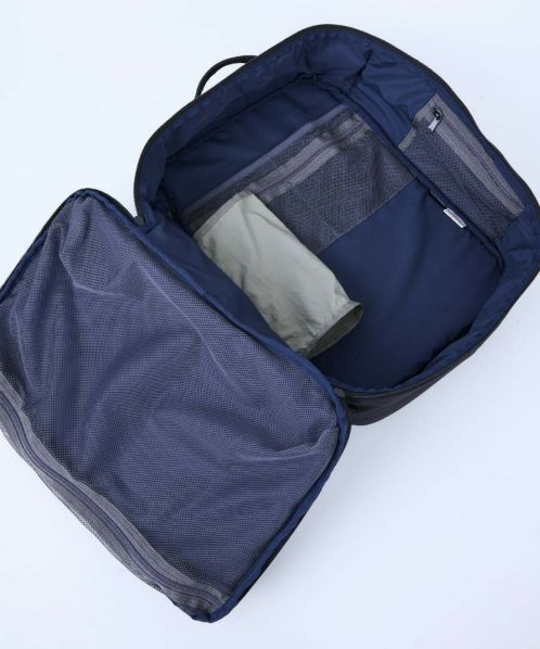 1泊2日の荷物をリュック一つでスマートに。ブランドのアイコニックとなる横開き仕様のリュック。大きなメッシュポケットは、荷物を可視化。立ったままでも荷物を取り出しやすいよう、ファスナーの始まり位置にもこだわっている。荷物が少なくても型崩れせず、自立する設計はどんな時もスタイリッシュ。