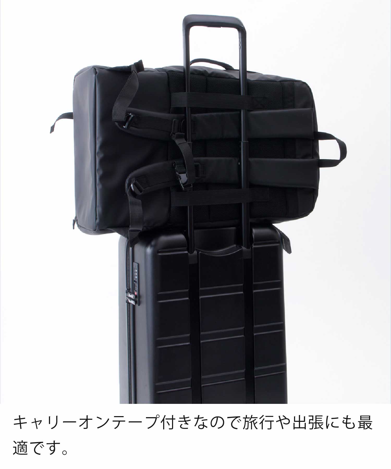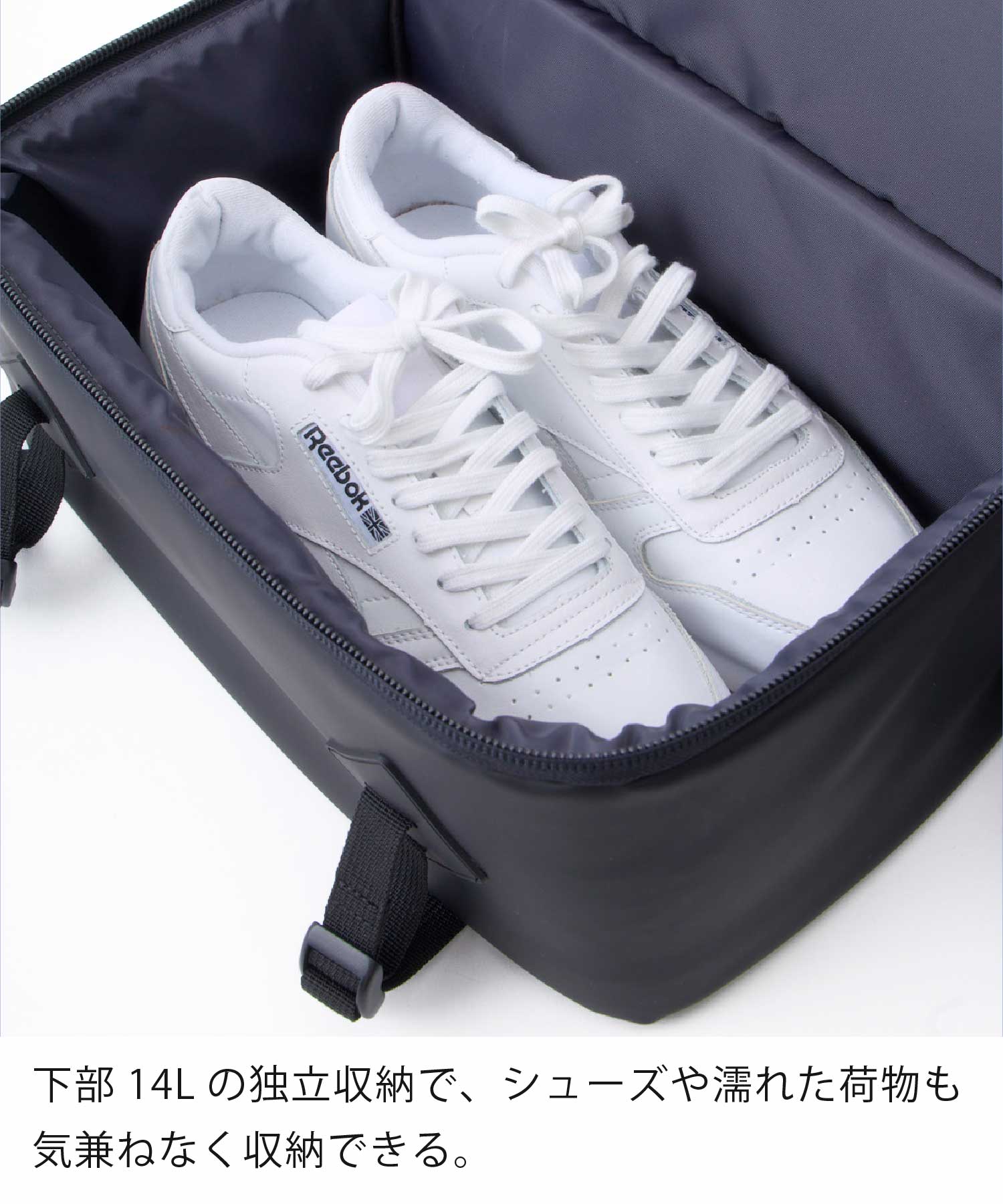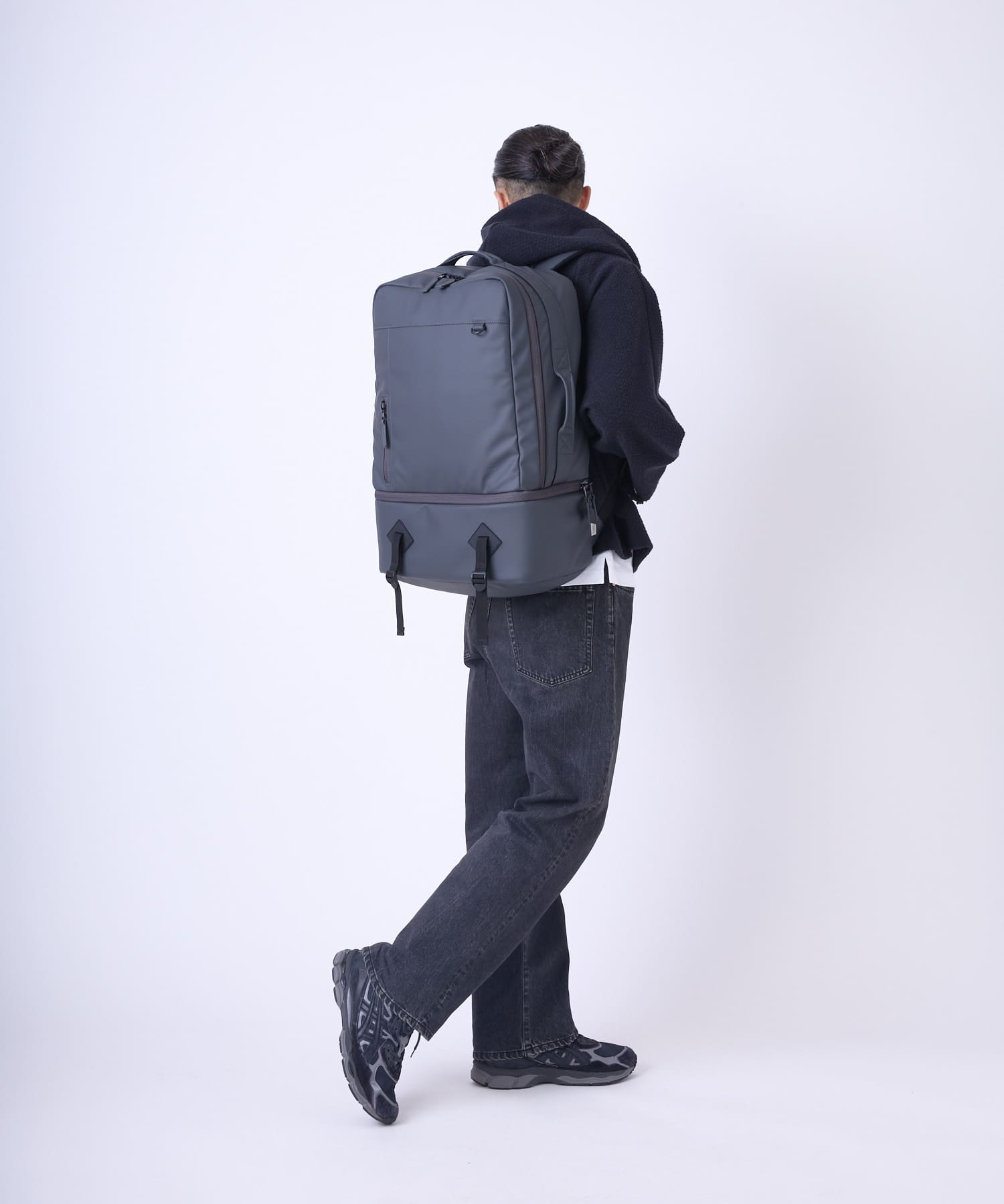 シーンを選ばない、心強さ。 総容量45Lの2層式バックパック。 上部31Lのメイン収納と下部14Lの独立収納で、シューズや濡れた荷物も気兼ねなく収納できる。 スムースマットな耐水生地で、急な雨にも慌てない。 機内持ち込みサイズだからスーツケース代わりにも。 旅も、ジムも、防災の備えも、これひとつで対応。 10ポケットで、どんなシーンでも整然と、スマートに。